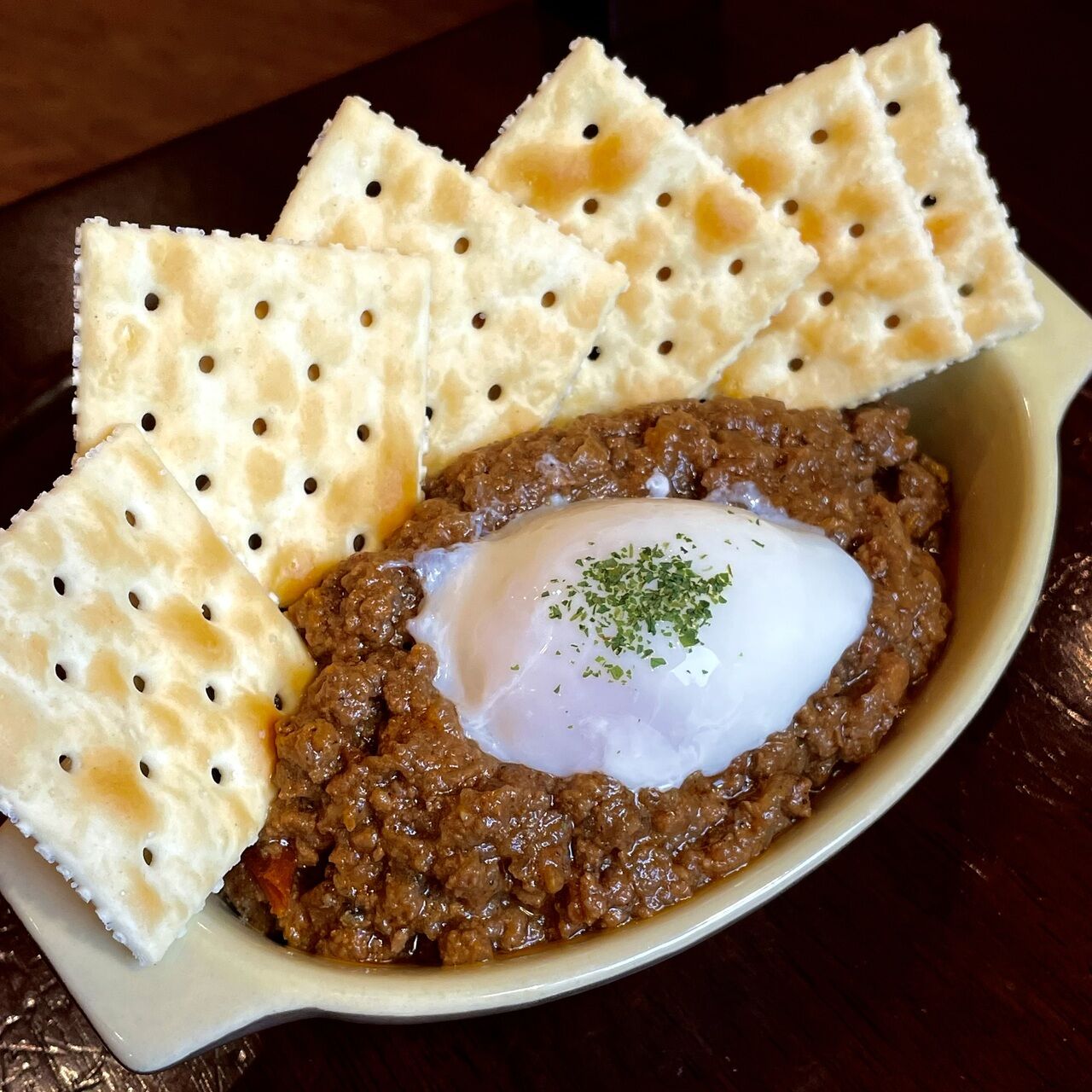 原宿名物。選べるキーマ or チキン。 スパイス香る本格カレーに温玉をとろり。 そのままでも、クラッカーにのせても最高。