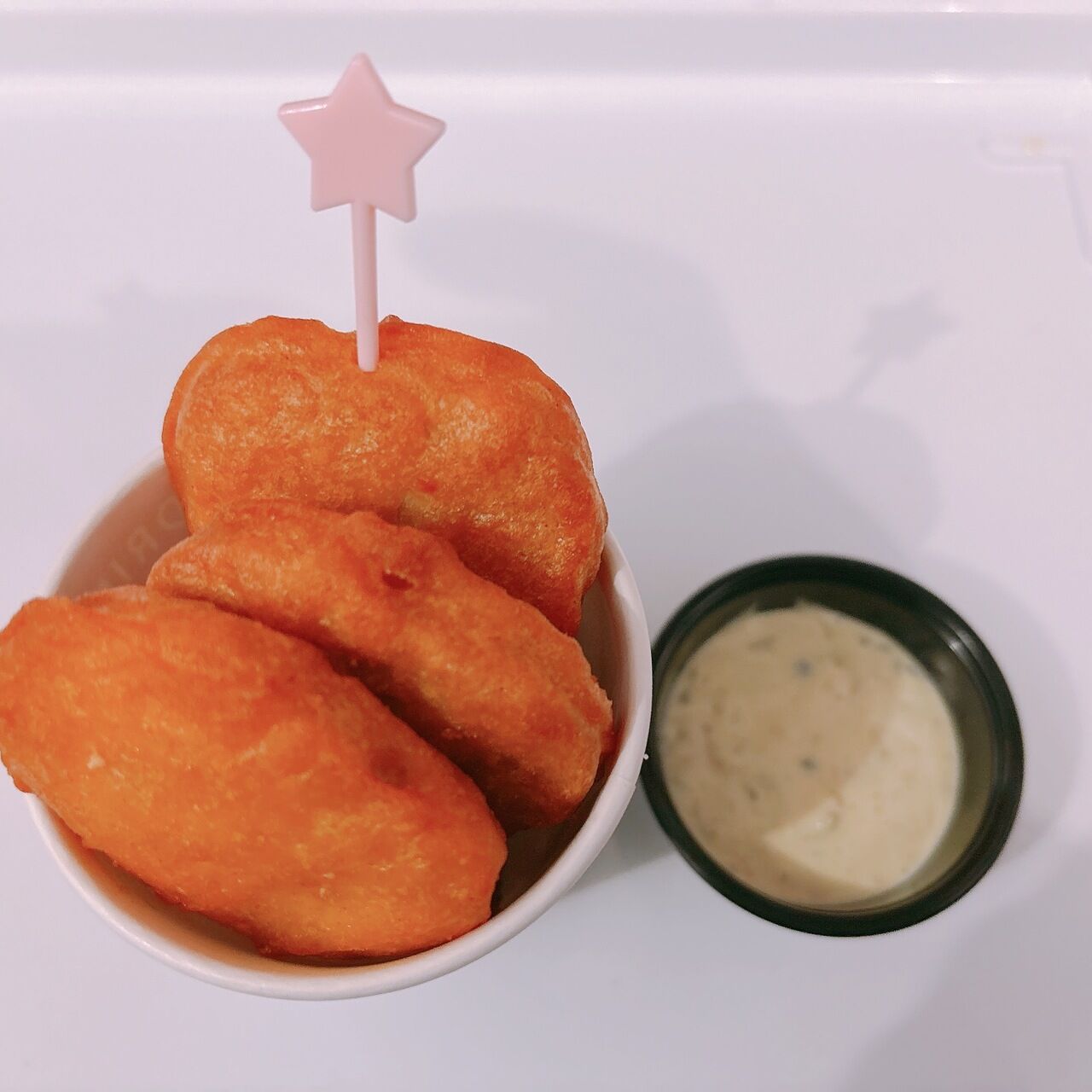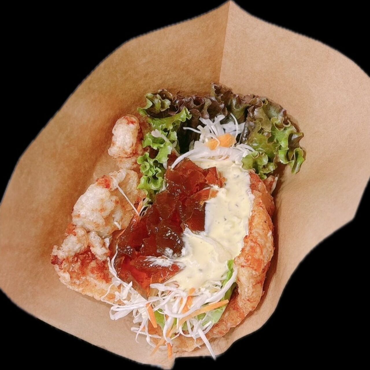鶏胸肉の大判唐揚げで生野菜を挟みソースを6種類から2種類選んでカスタマイズできます。