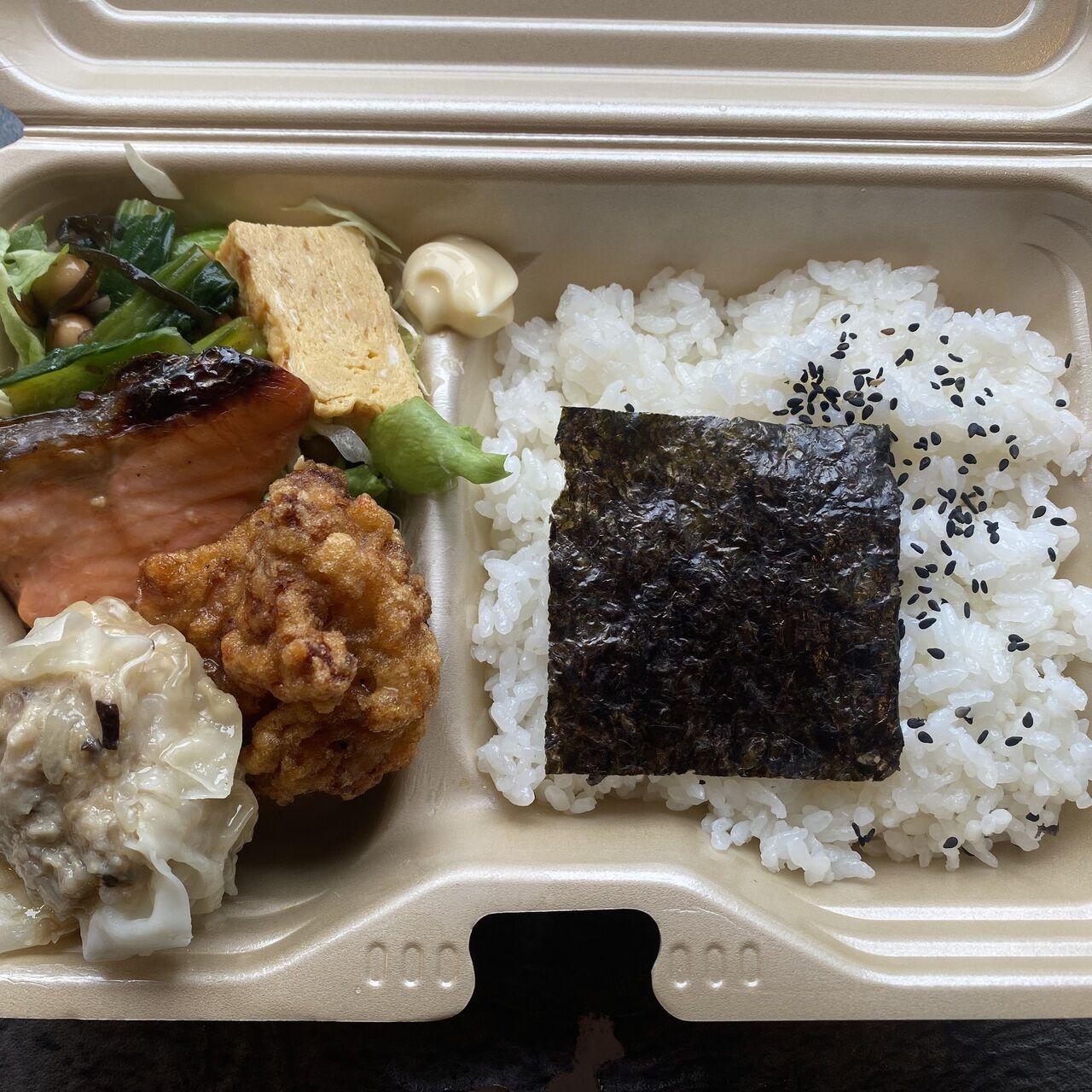 みやじ豚シュウマイ、銀鮭味噌焼き、鶏唐揚げ