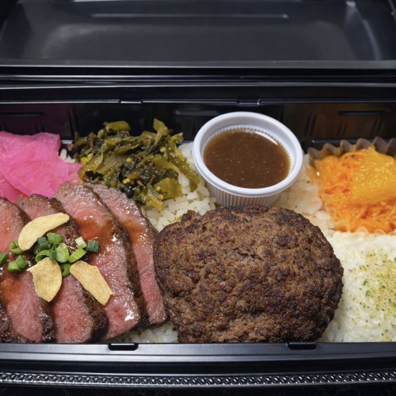 当店自慢のステーキと、100%赤城和牛ハンバーグがどちらも味わえるスペシャル弁当。肉肉しいハンバーグと自家製さわやかソースとの相性は秀逸です。