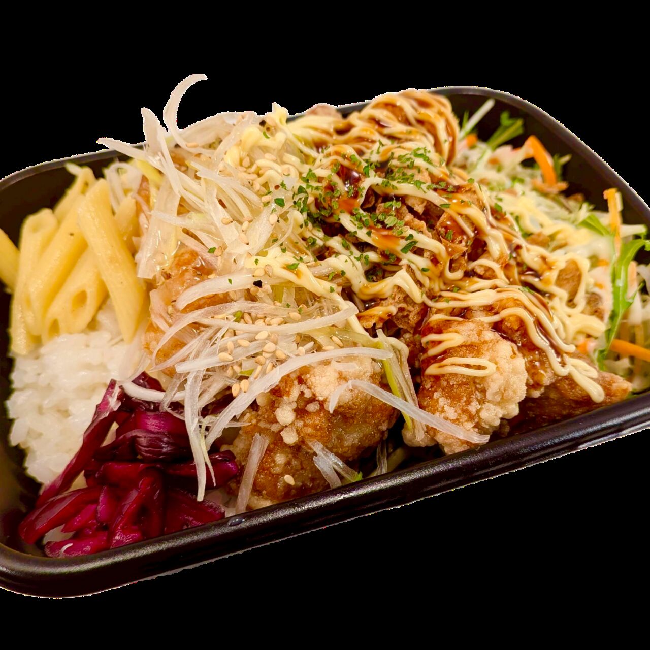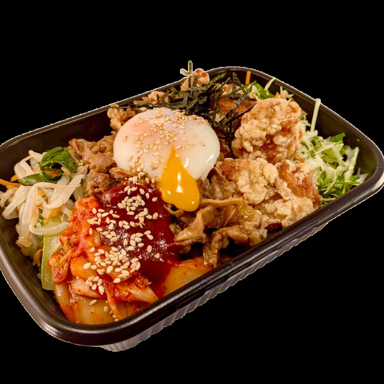 焼肉ビビンバにから揚げをトッピング!ソースは1種類お選び頂けます。