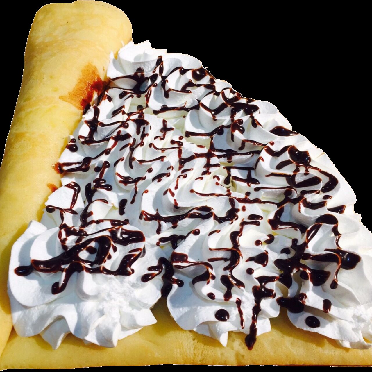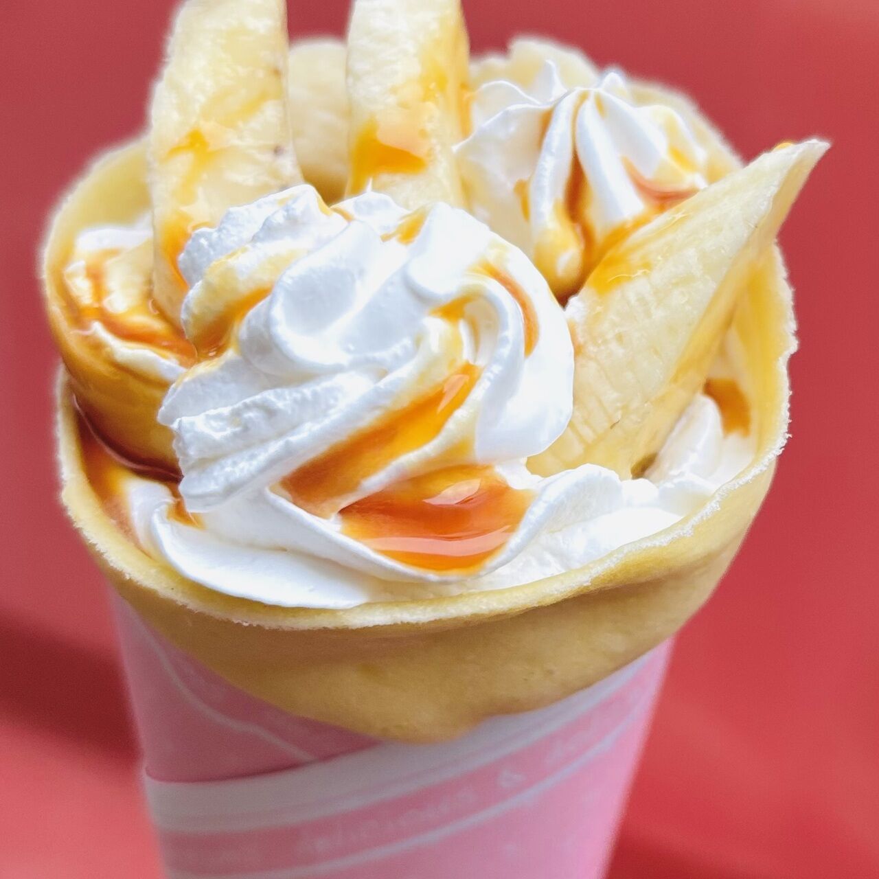 もっちりふわふわ生地にたっぷりホイップとバナナにとろ〜りハーシーチョコを乗せた当店No.1商品です