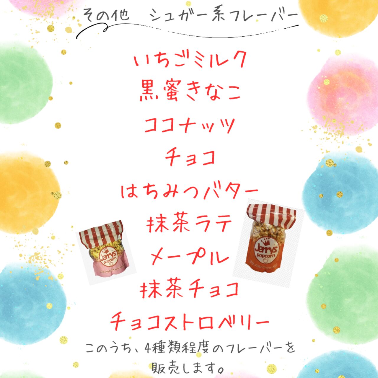 甘いポップコーンは他にもいろいろあります!この中から4種類程度を選んで販売します。どのフレーバーが出るかはお楽しみ(^^)