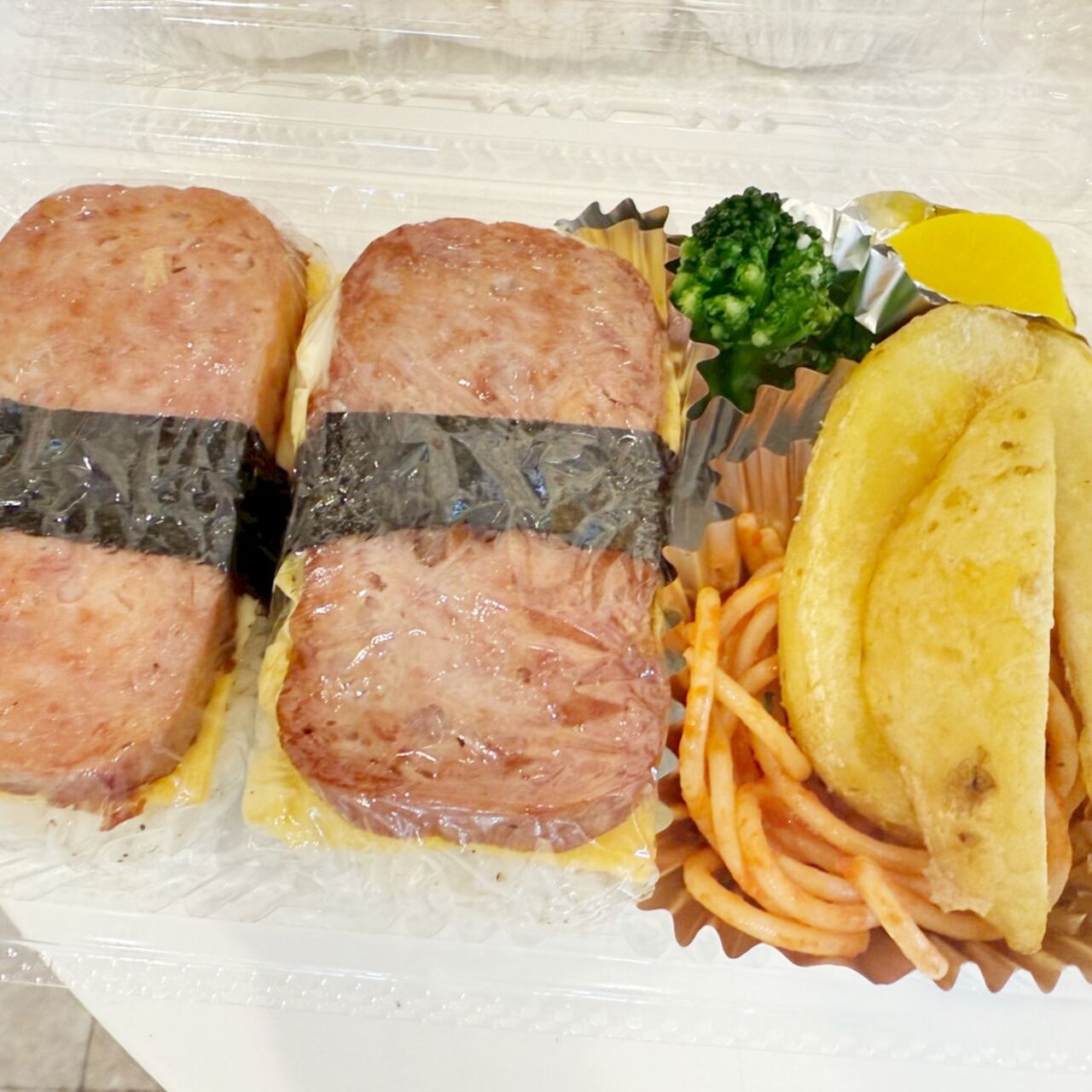 スパムおにぎり2個とパスタ、ポテト、ブロッコリー、沢庵のセットです。
