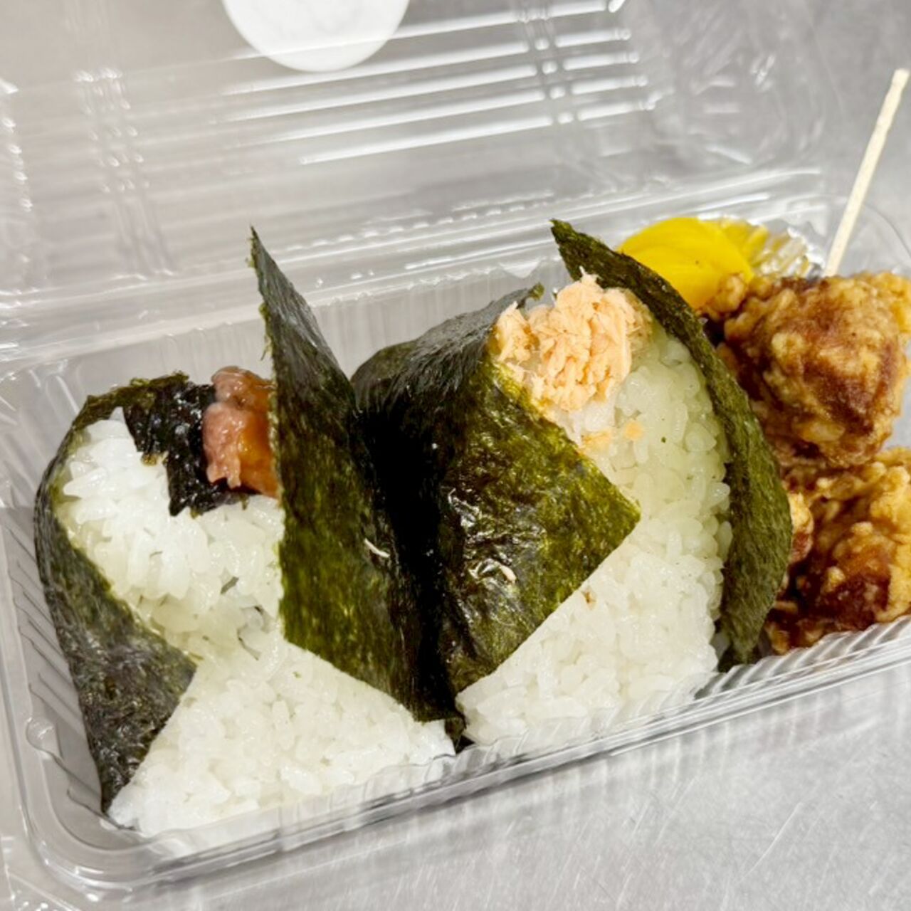 おにぎり2個と唐揚げ、沢庵のセット