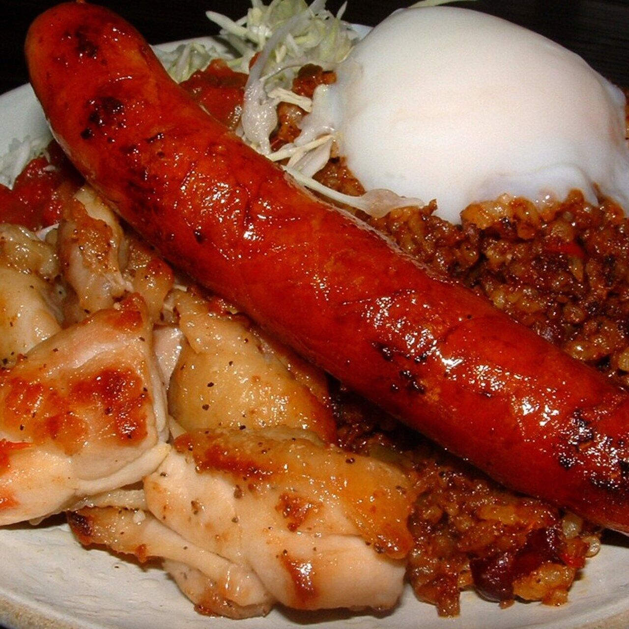 ジャンバラヤにチキンとチョリソをのせました。