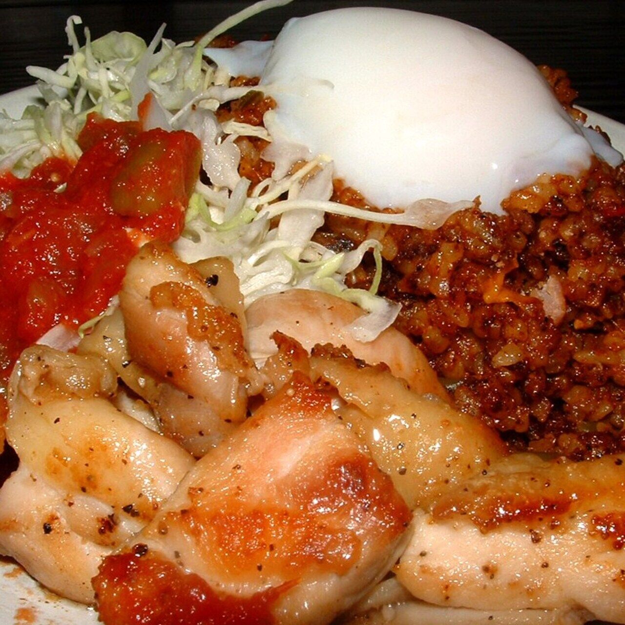 ジャンバラヤの上に焼きたてチキンをのせました。