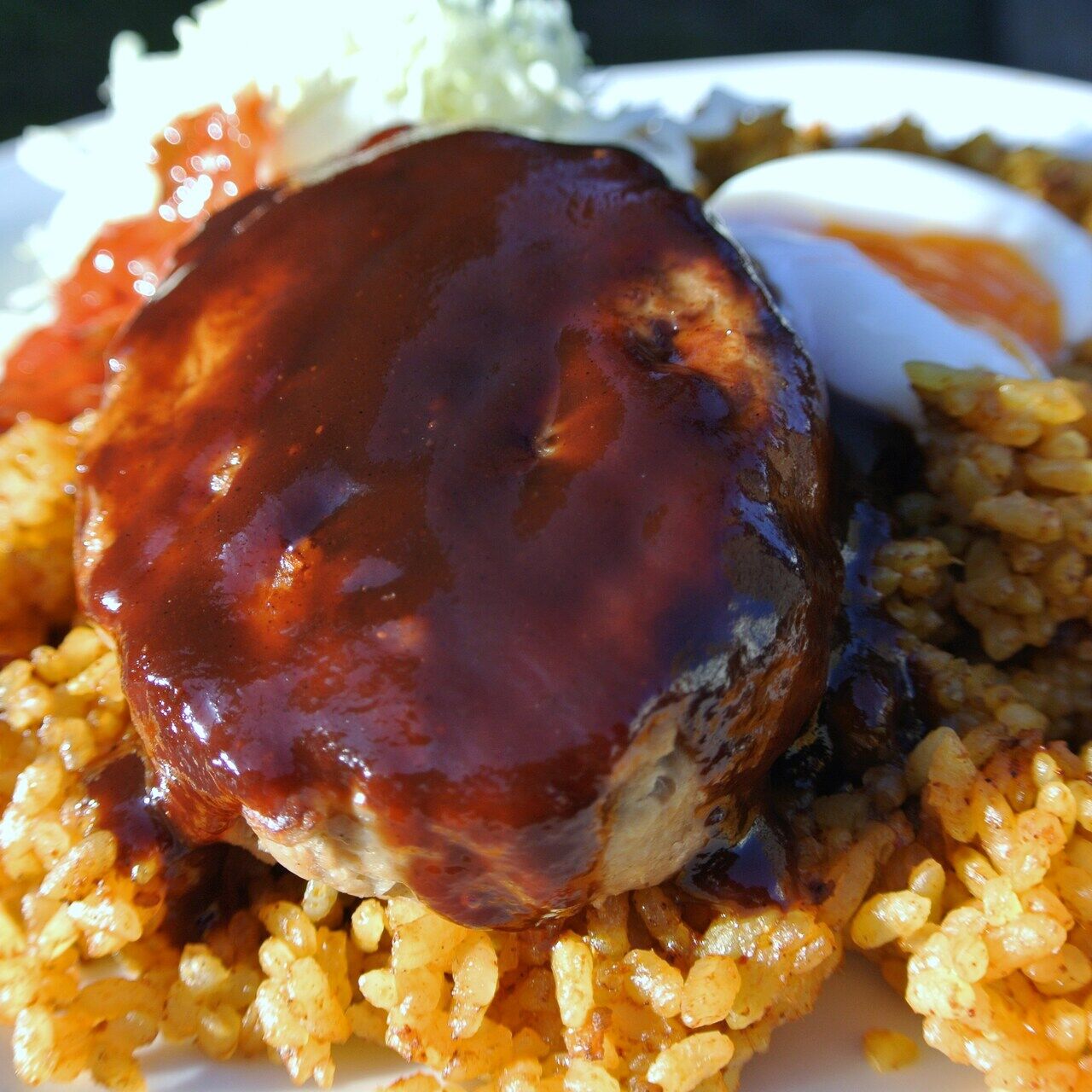 ジャンバラヤの上に焼きたてハンバーグをのせました。