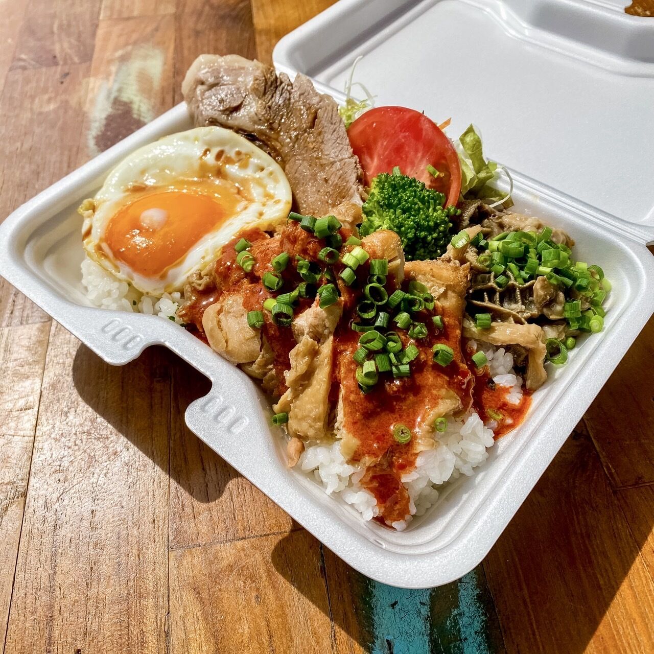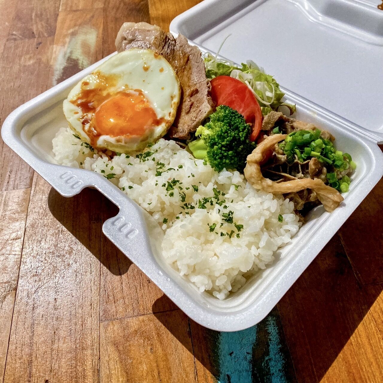 チャーシュー、ホルモン、煮鶏、煮フランクの中から2種のお肉を選べる欲張り弁当です。ハーフ(お肉1/2)通常(お肉1枚)どの組み合わせでもとろ~り目玉焼き付き!