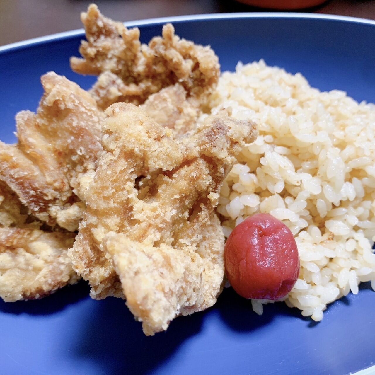 唐揚げと同じ出汁を使って炊いた後に、鷄節を混ぜ込んだご飯と唐揚げが3粒ついております。