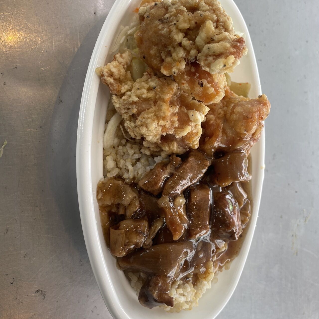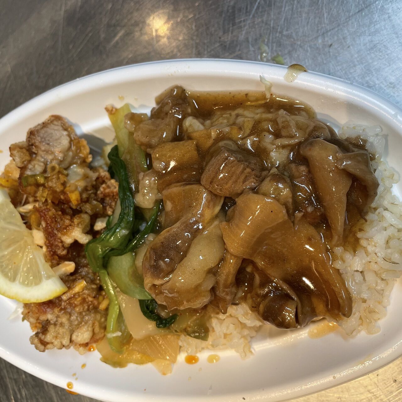 牛肉と牛筋の柔らか煮込み丼に大人気の油淋鶏との贅沢な大満足のコンボ、です。