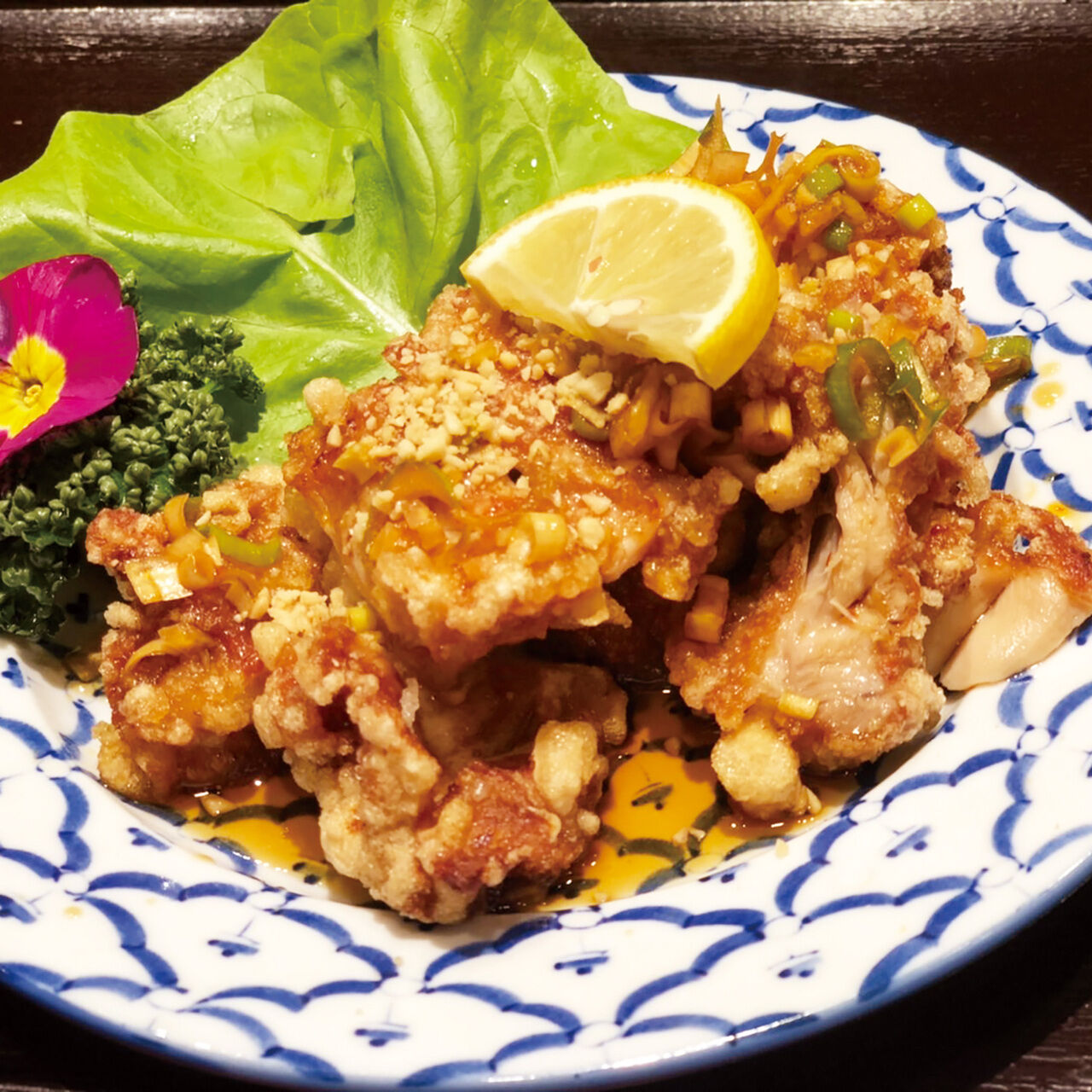 とても柔らかくてジューシーな鶏もも唐揚げに台湾独特の塩をふりかけて!大人気です。