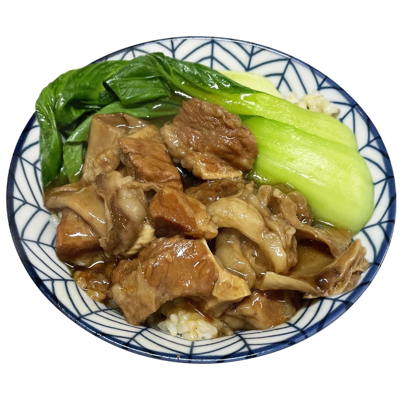 牛腩肉と牛筋の柔らか煮込み丼に大きくて柔らかくてジューシーな台湾風味の唐揚げを乗せたコンボ!とってもお得、ボリュームも満点です!