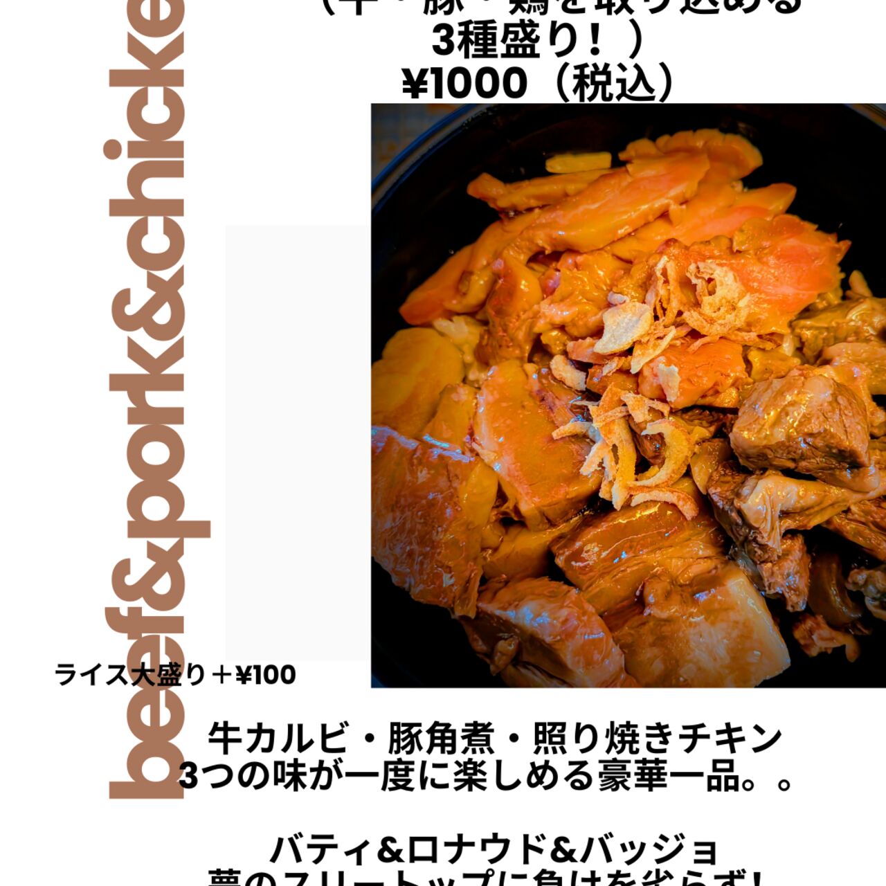 牛カルビ・豚角煮・鶏照り焼きを合わせた贅沢ドン