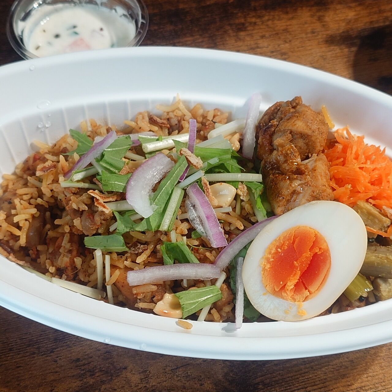 近年話題のインド風炊き込みご飯です。パラパラとした食感のバスマティライスをスパイシーに炊き上げました。専用のヨーグルトソースをかけて味変もできます。