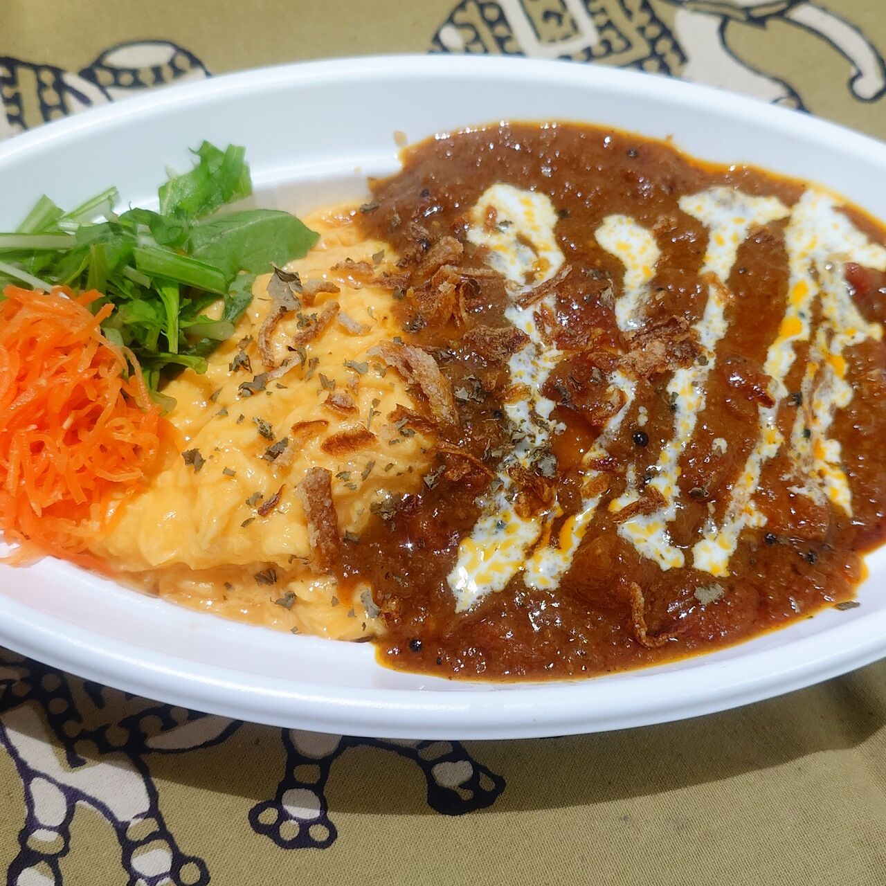 スパイシーなビリヤニをフワフワ玉子で包みました。選べるカレーソース付き。