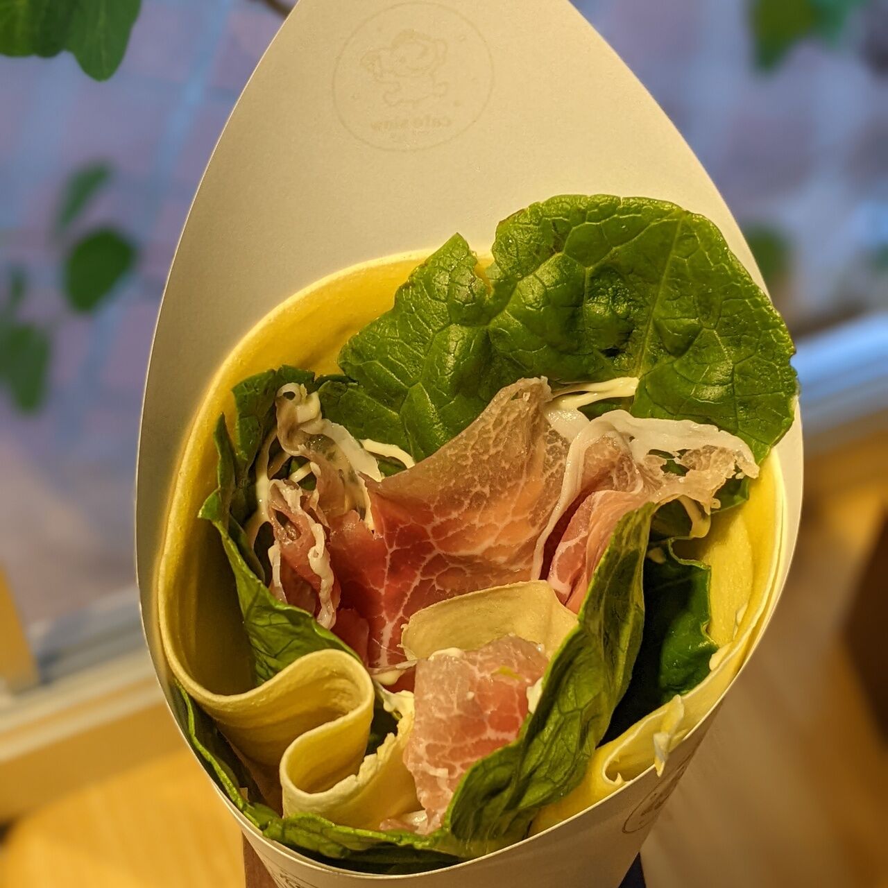 塩気のある生ハムとシャキシャキ野菜を包んだ、さっぱりおかずクレープ。