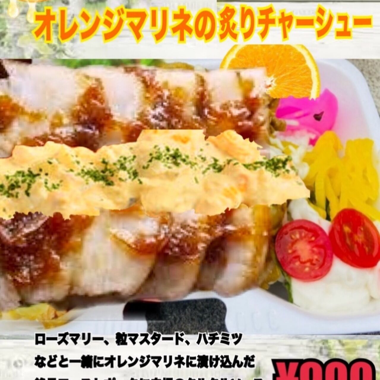 オレンジ、ローズマリーなどが入った、醤油ベースの洋風なソースで漬け込んだ焼豚。軽く炙ってから御提供いたします。特製タルタルとの相性も抜群ですよ!