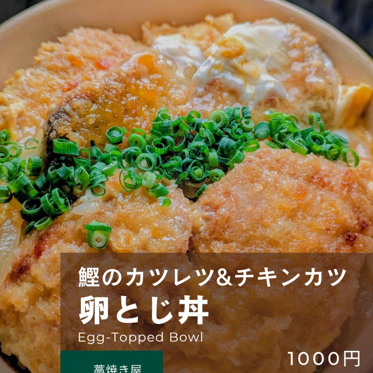 藁焼きした鰹のカツレツとチキンカツを贅沢に卵でとじこめたボリューム満点丼!ご注文頂いて卵とじにするので温かいできたてでホッとする丼ぶりです。