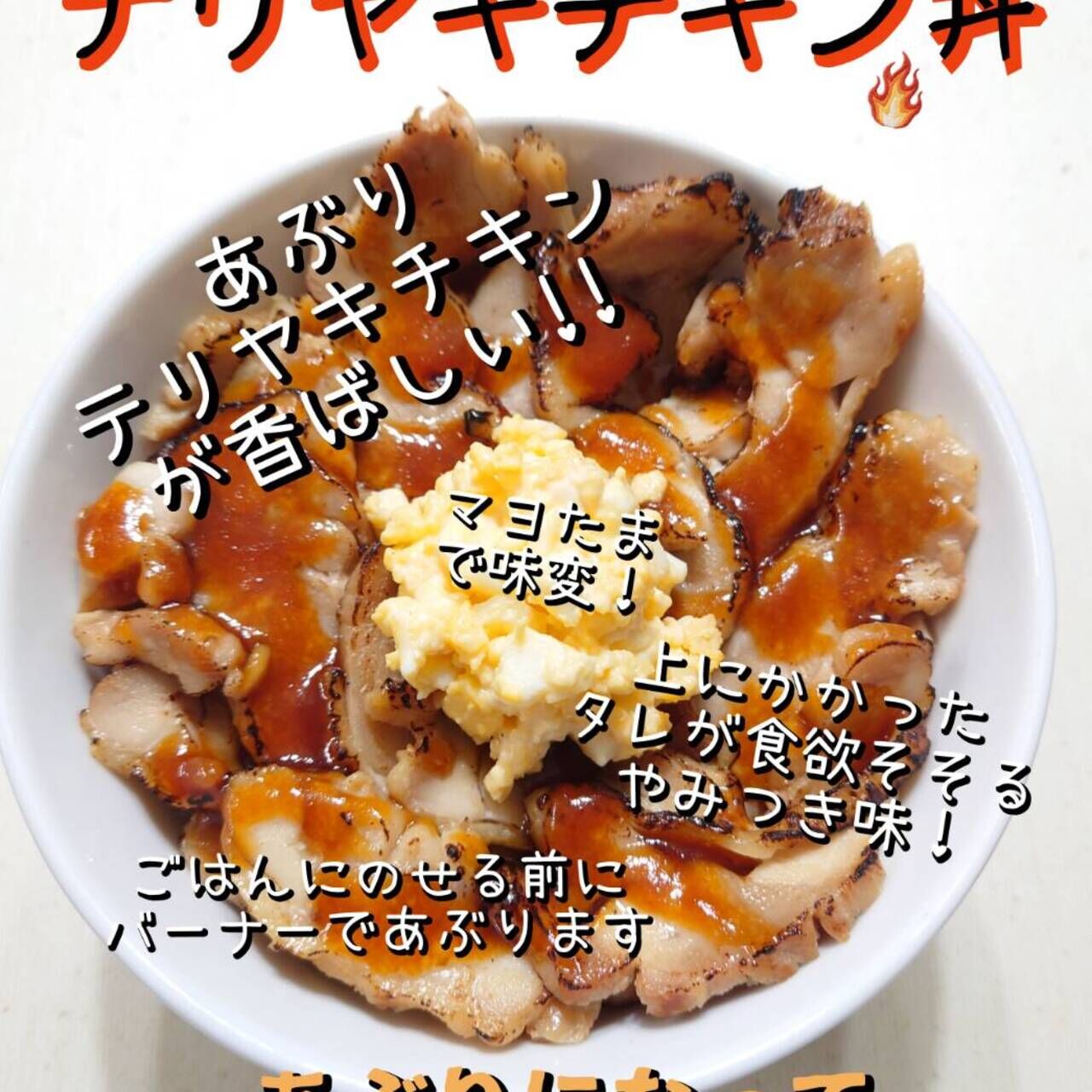 甘酢醤油でてりやきにしたチキンを炙り、そこにチキンから出たコラ-ゲンたっぷの特製タレとマヨたまをトッピングしました。