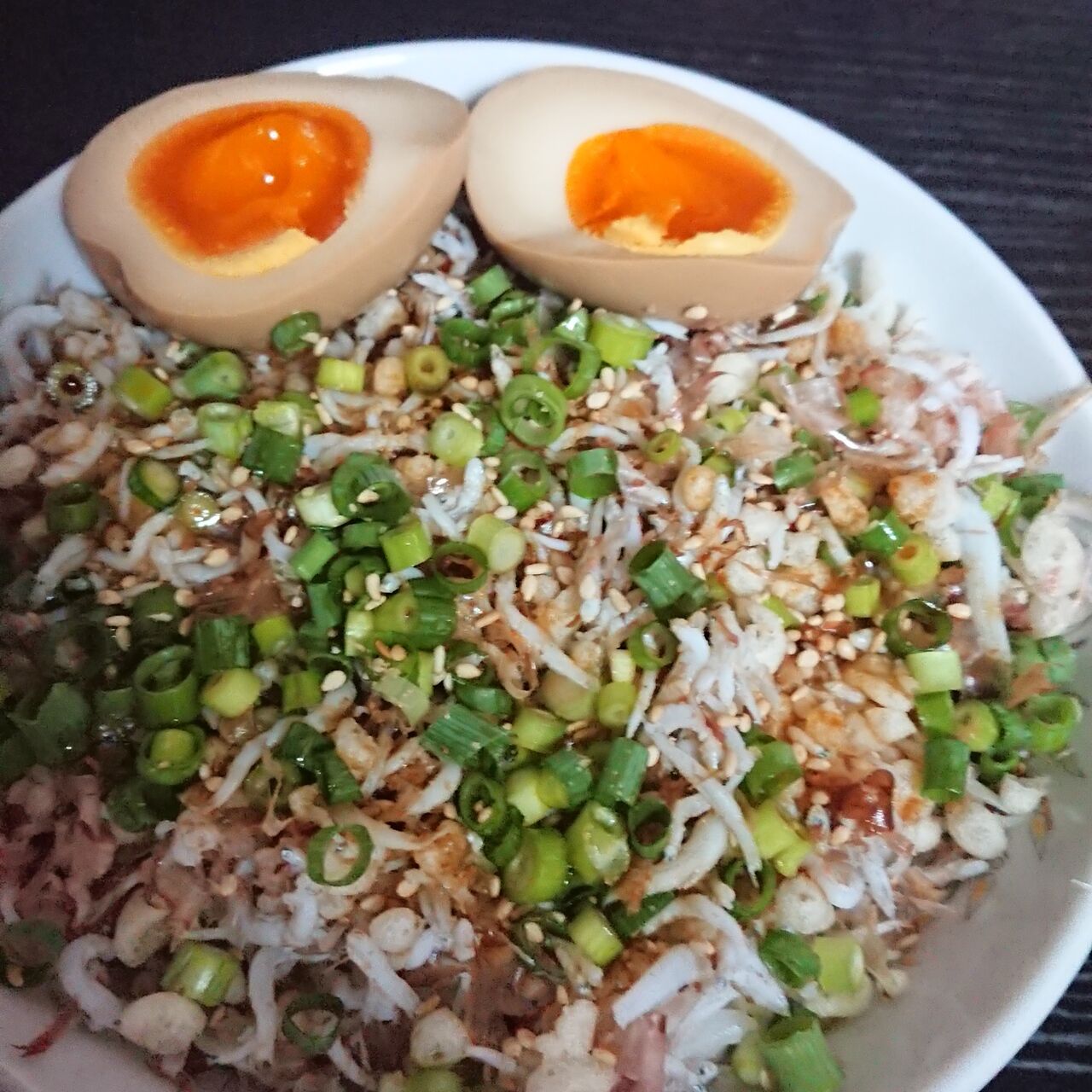 釜揚げしらすと天かすと鰹節の丼です