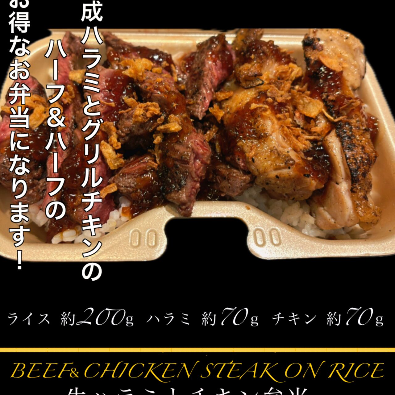 人気の牛ハラミとチキンのハーフ弁当になります。