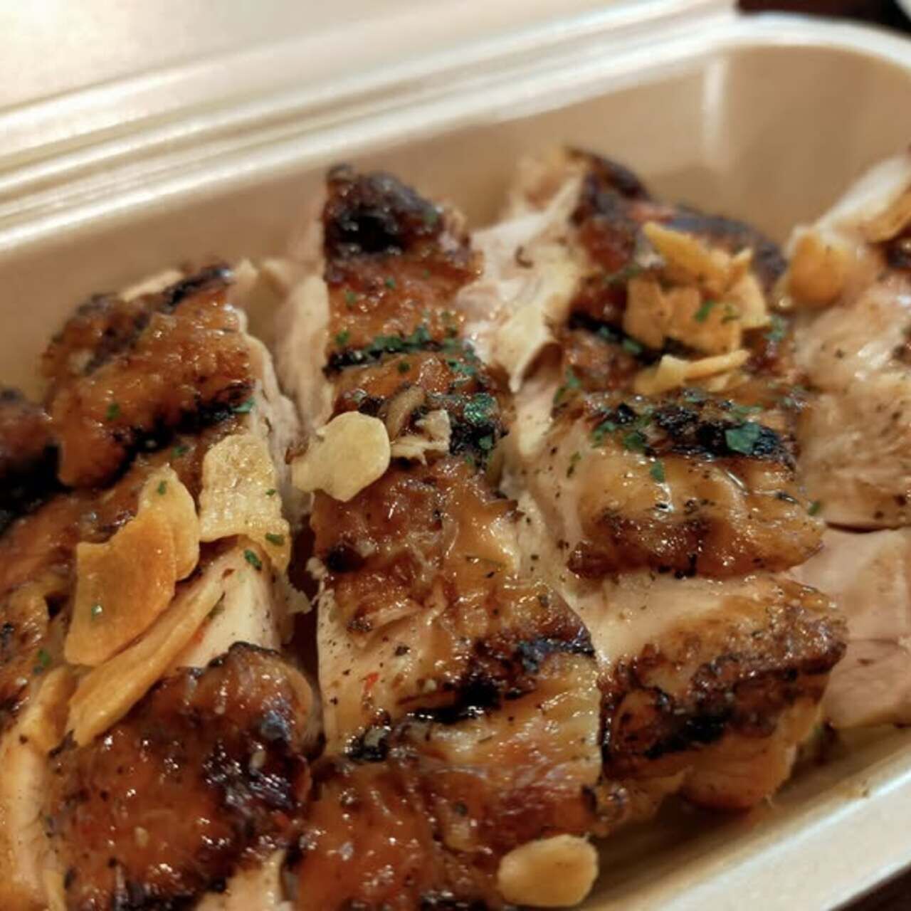 極厚の鉄板で焼き上げた鶏肉と玉ねぎが入った甘めのステーキソースをかけております。