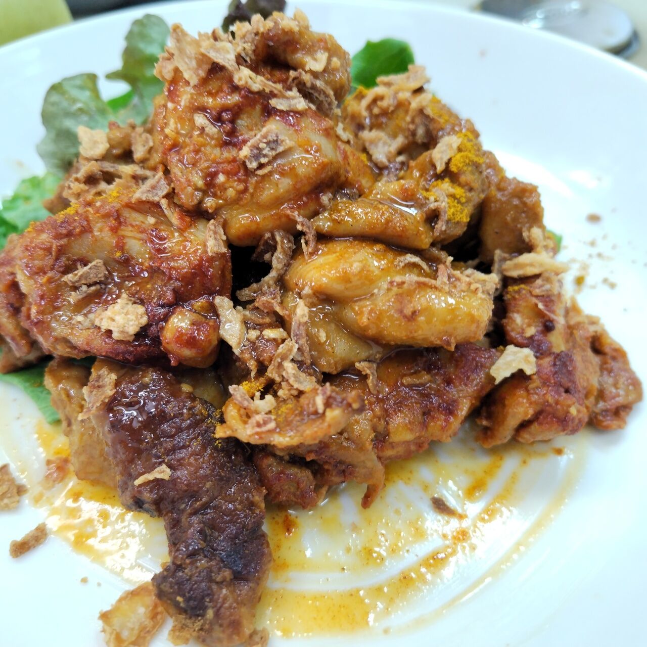 フライドガーリックやオニオンフライと和えたタンドリーチキン