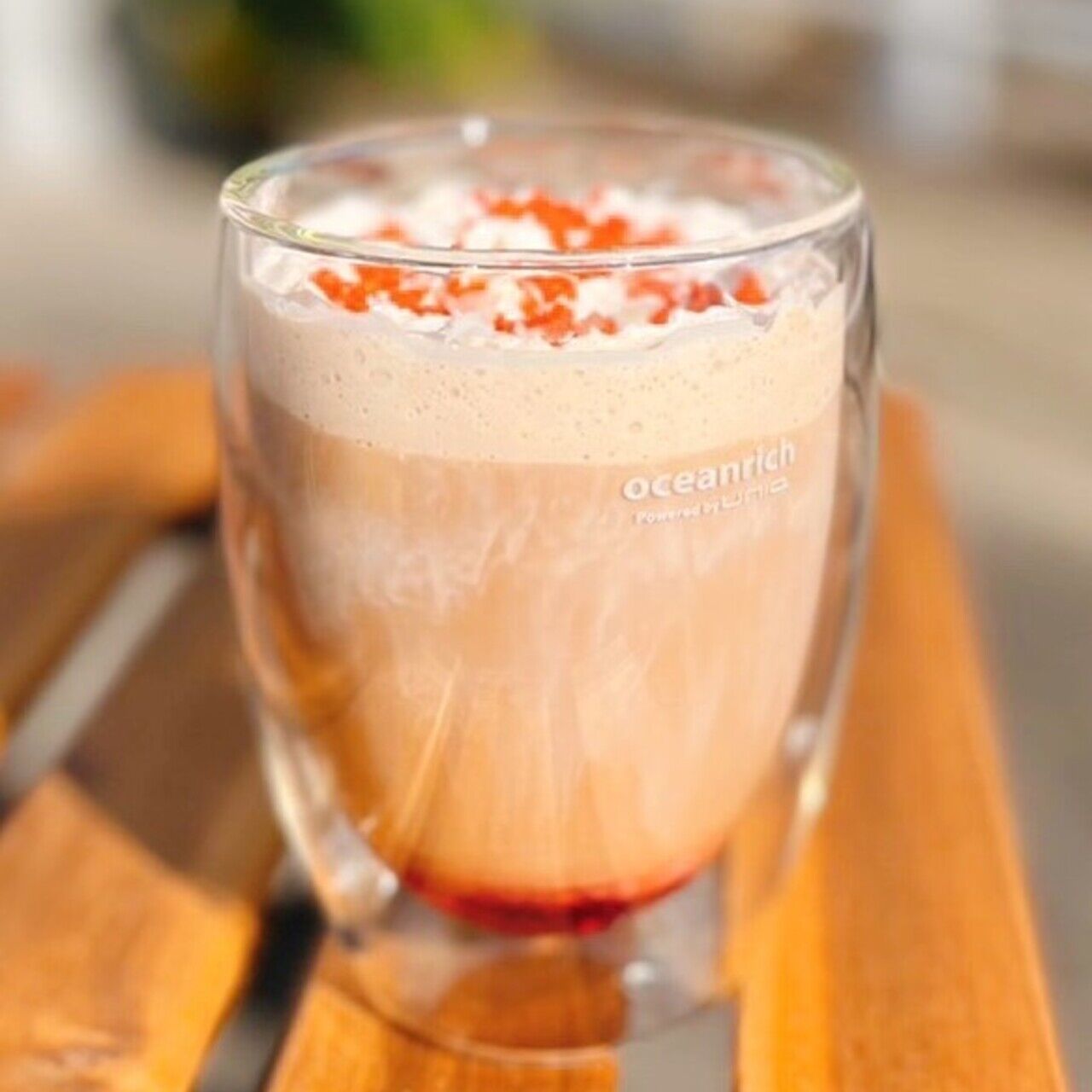 イチゴフレーバーのカフェラテです。 程よいイチゴの香りがコーヒーを引き立てます。