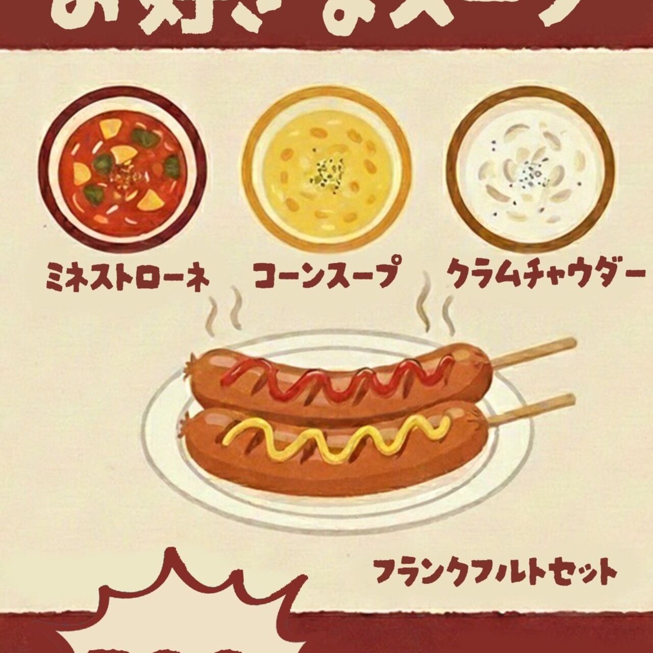 「スープだけじゃ少し物足りない…」そんな声にお応えする、ボリューム満点のセットメニュー。 濃厚なスープをひと口、そして旨味たっぷりのフランクフルトをガブリ。