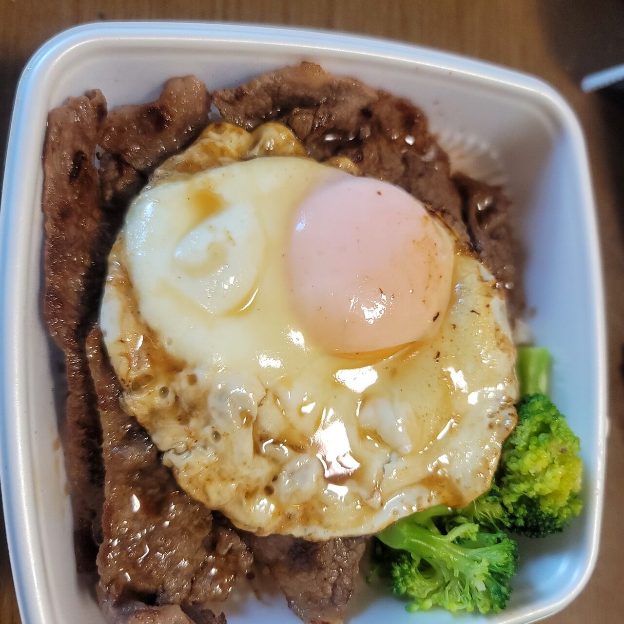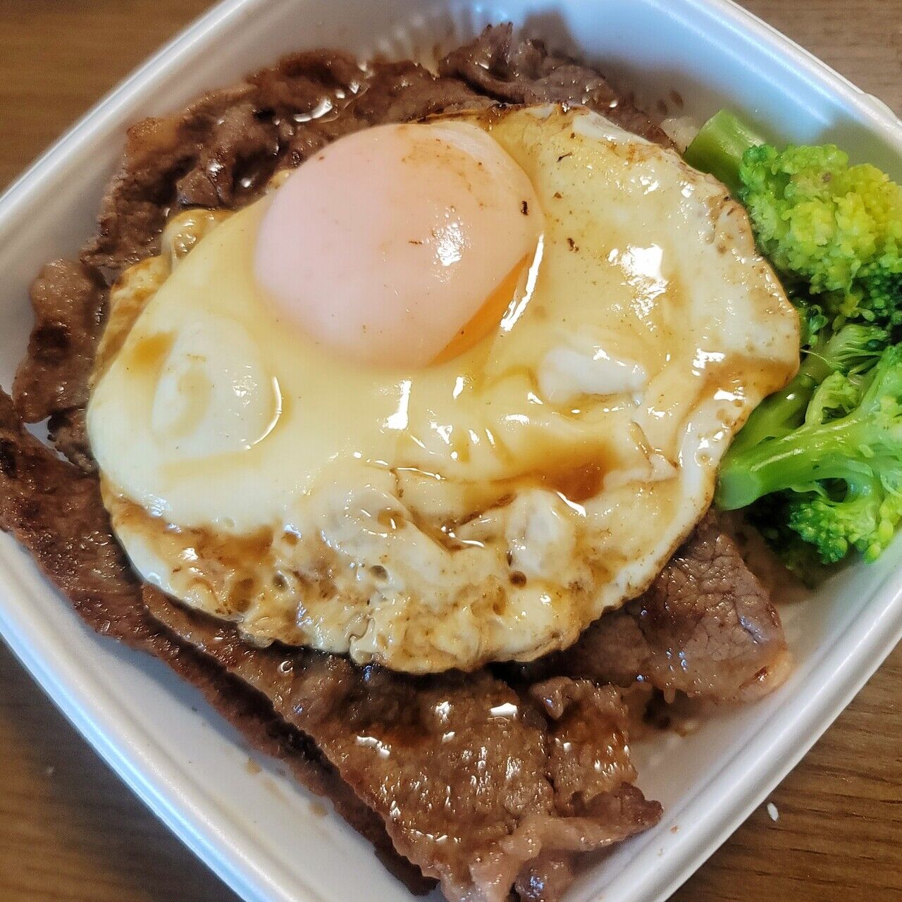 牛カルビ焼肉に目玉焼き!自家製甘辛ダレが合う!
