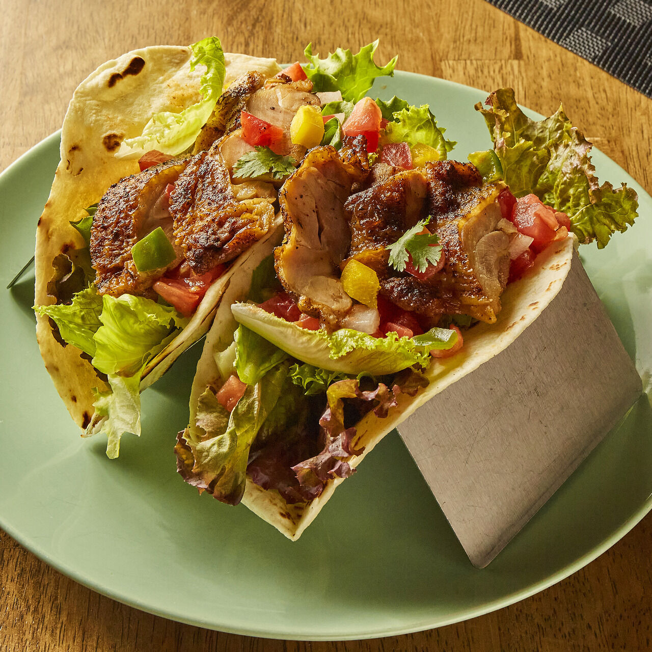 2個のタコスをハンバーガーみたいに合体させて、こぼれないように挟み焼しました。