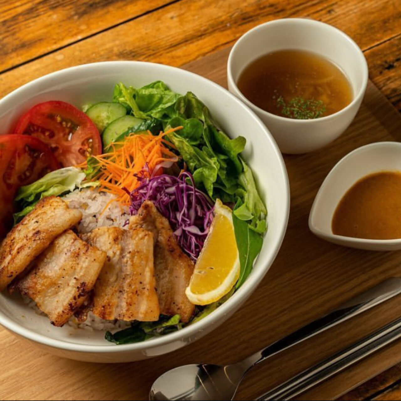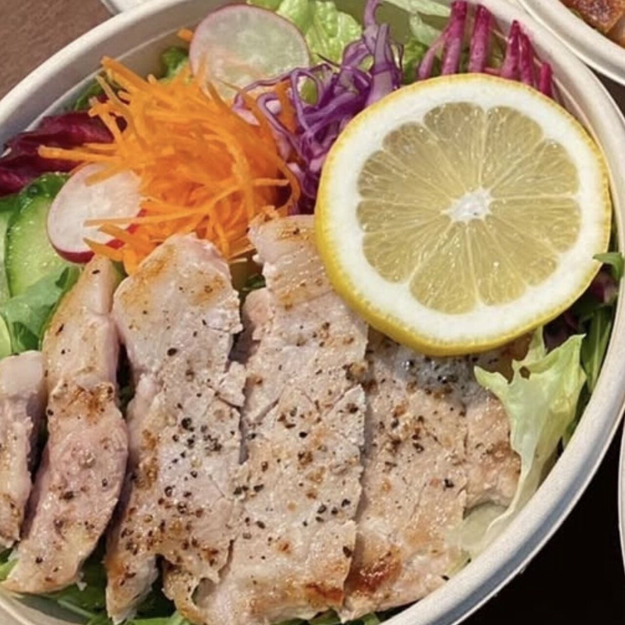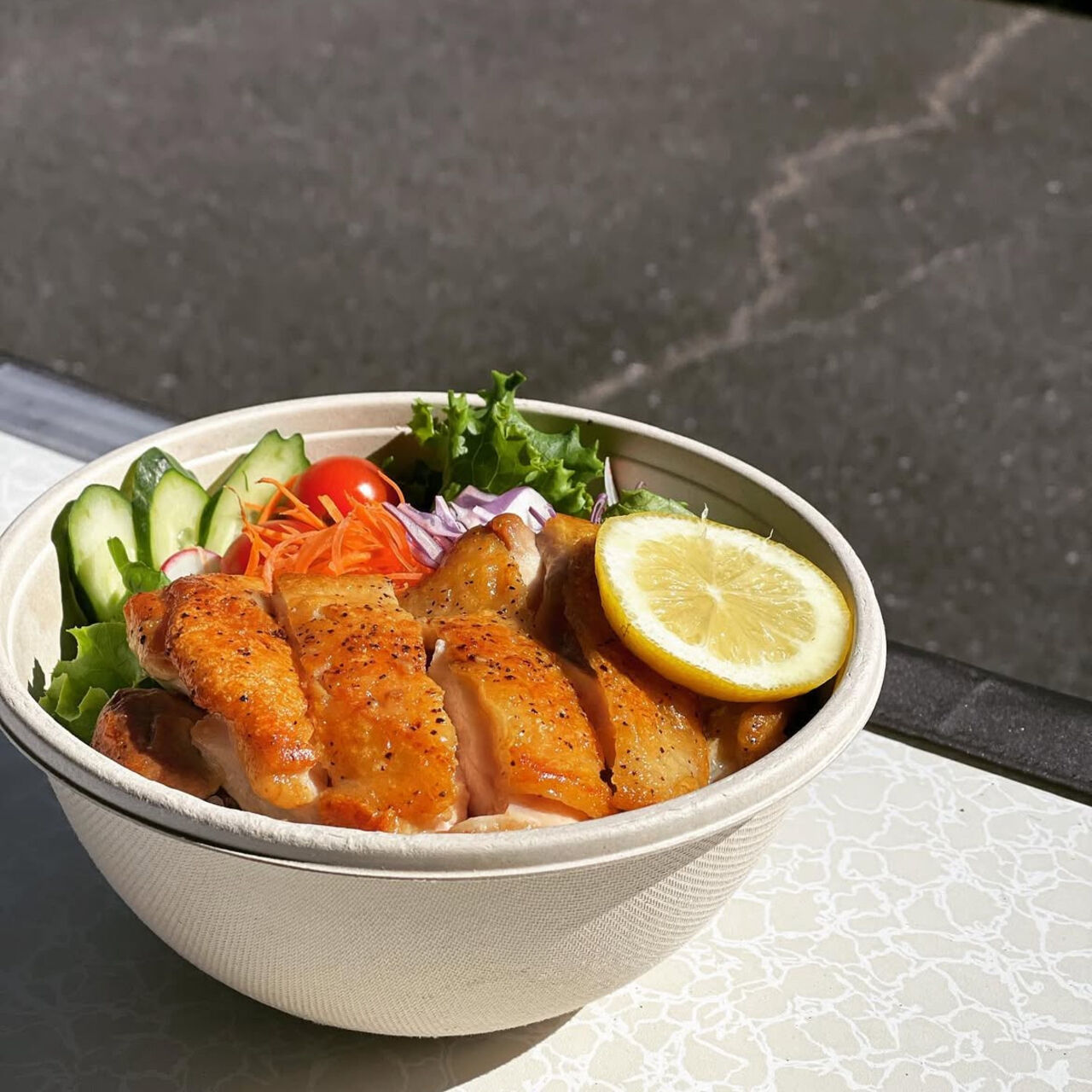 ご飯の上に野菜と焼いたチキンを乗せてオリジナルソースを付ける