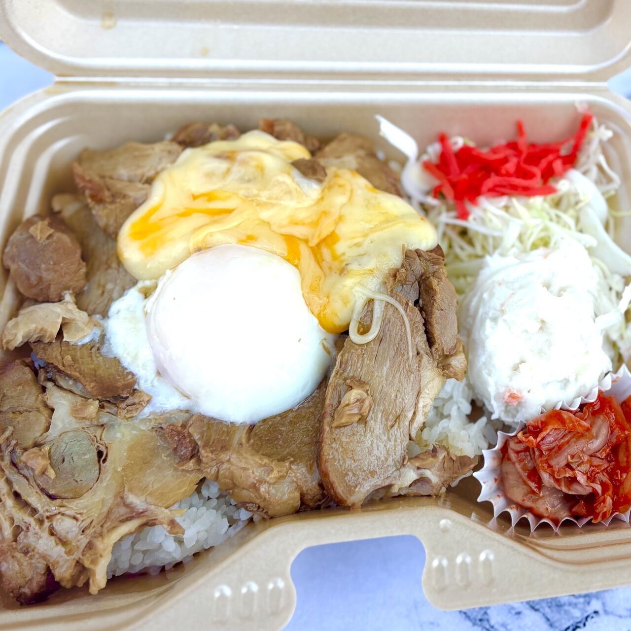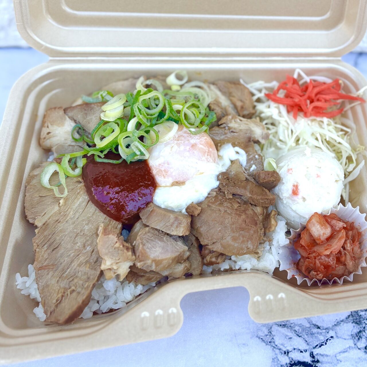 ジューシーなチャーシューとトロ~リ温玉が乗った絶品丼!柔らかい肉としっかりしたタレで、満腹感満点のランチに最適!