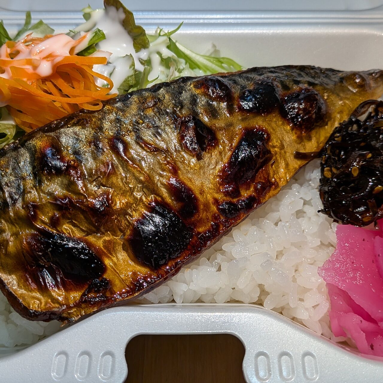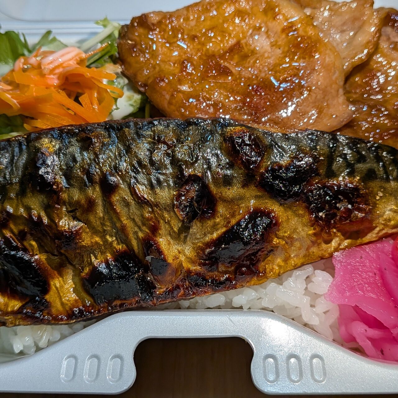 羽釜炊きご飯と若鶏の照り焼きにさばの塩焼きの合盛り弁当。グリーンサラダでさっぱり召し上がれます。