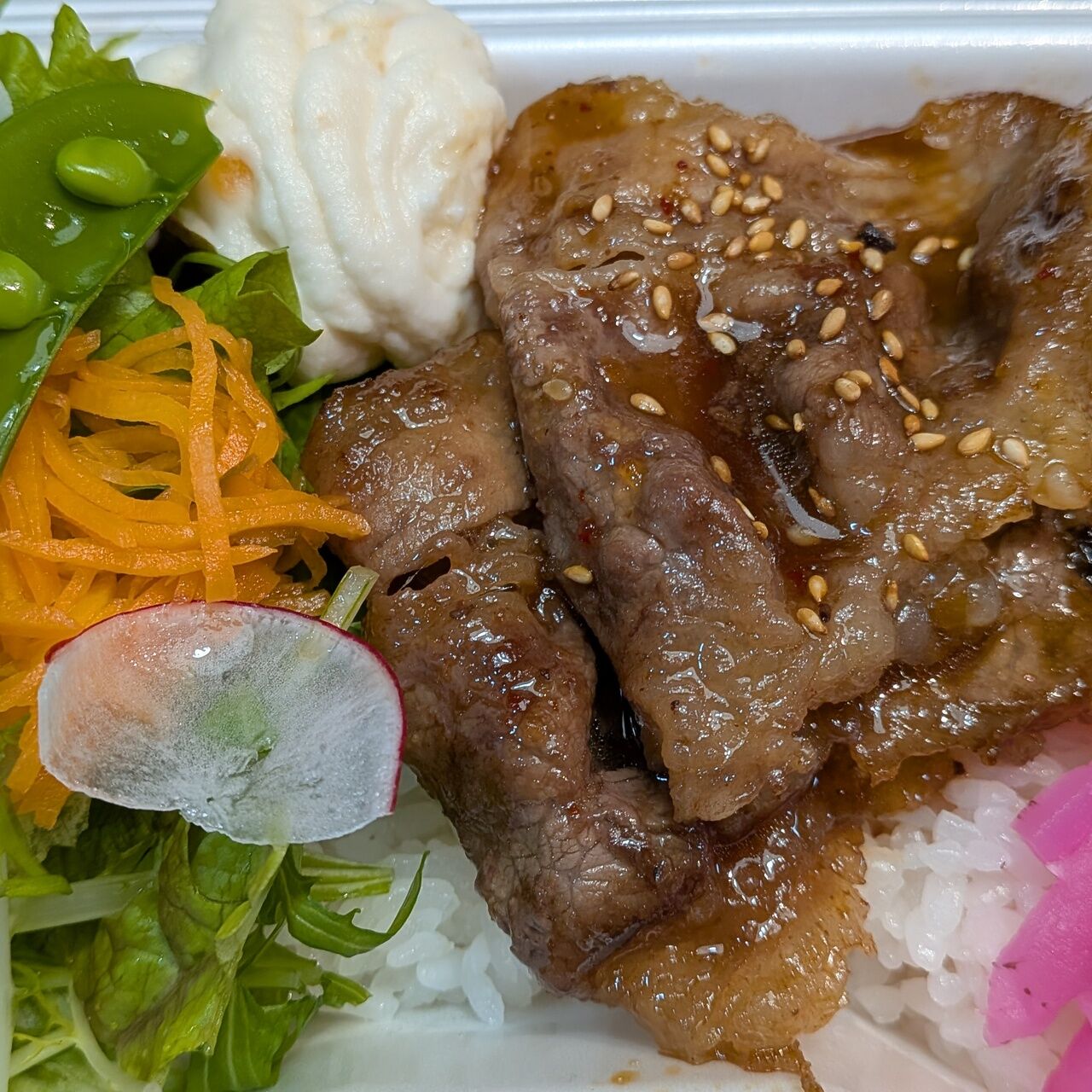 羽釜炊きご飯の上に甘辛いタレの牛カルビをたっぷりのせました。グリーンサラダと一緒にサッパリ召し上がれます。トッピングでおにぎり具材、江戸前海苔を追加出来ます。