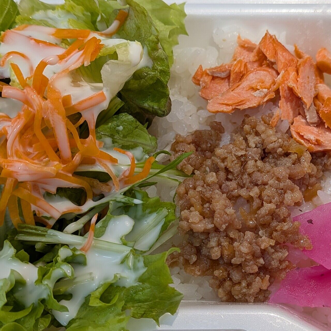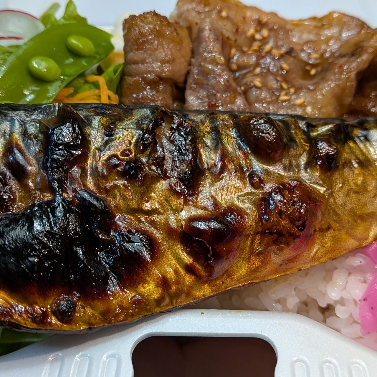 羽釜炊きご飯の上に豚のしょうが焼きとさばの塩焼きをのせました。グリーンサラダでさっぱり召し上がれます。トッピングでおにぎり具材、江戸前海苔を追加出来ます。