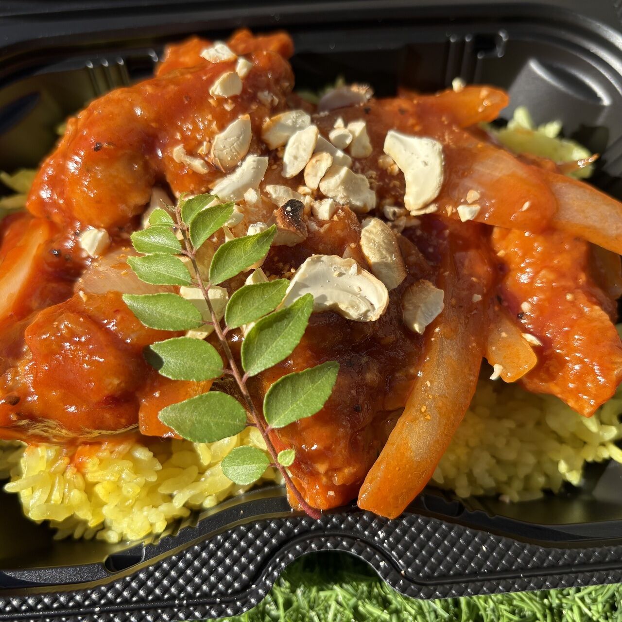 鶏肉、玉ねぎ、トマト等と炒め合わせた料理です。味付けは、唐辛子、チリソース、ケチャップ、醤油、酢、砂糖等をベースにした、甘辛く強い酸味と旨みのあるソースです。