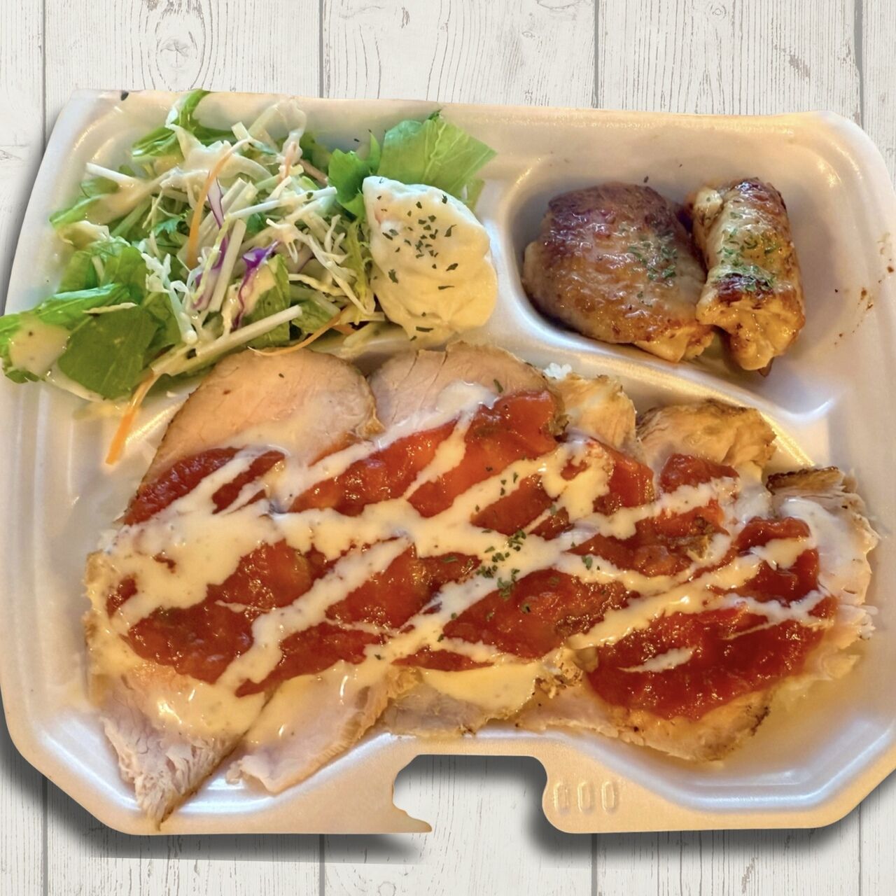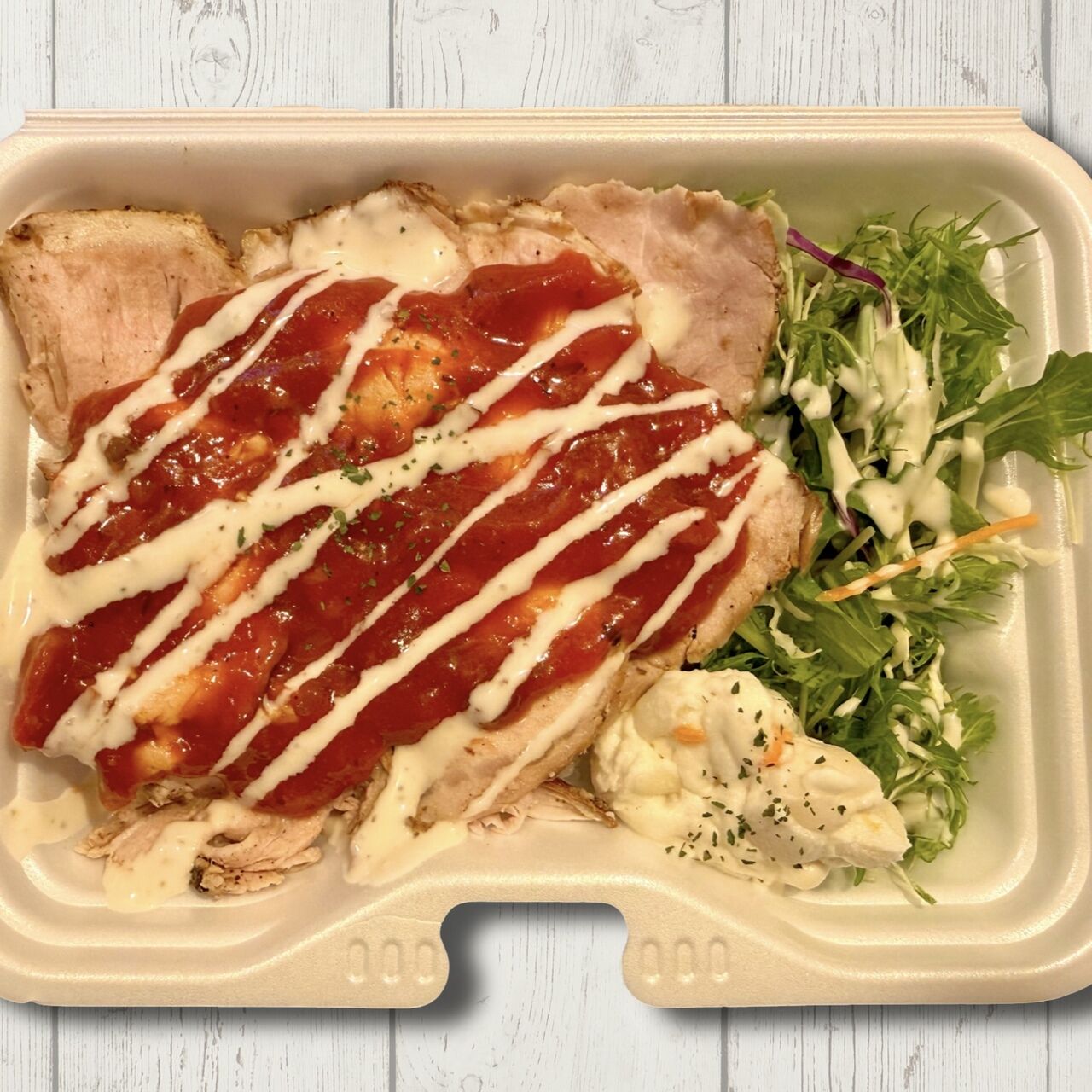 低温調理でしっとりジューシーに仕上げたローストポークにしベースのソースに刻みガーリックが食欲をそそります。