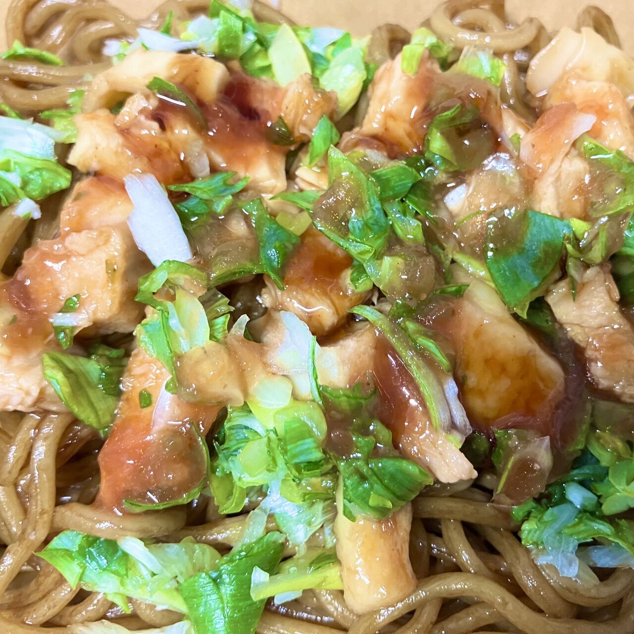 当店自慢の野菜の出し汁を使ったソース焼きそばに、照り焼き味のチキンとネギを混ぜ入れました。仕上げに特性トマト玉ねぎソースをかけます。マヨネーズはお好みで。