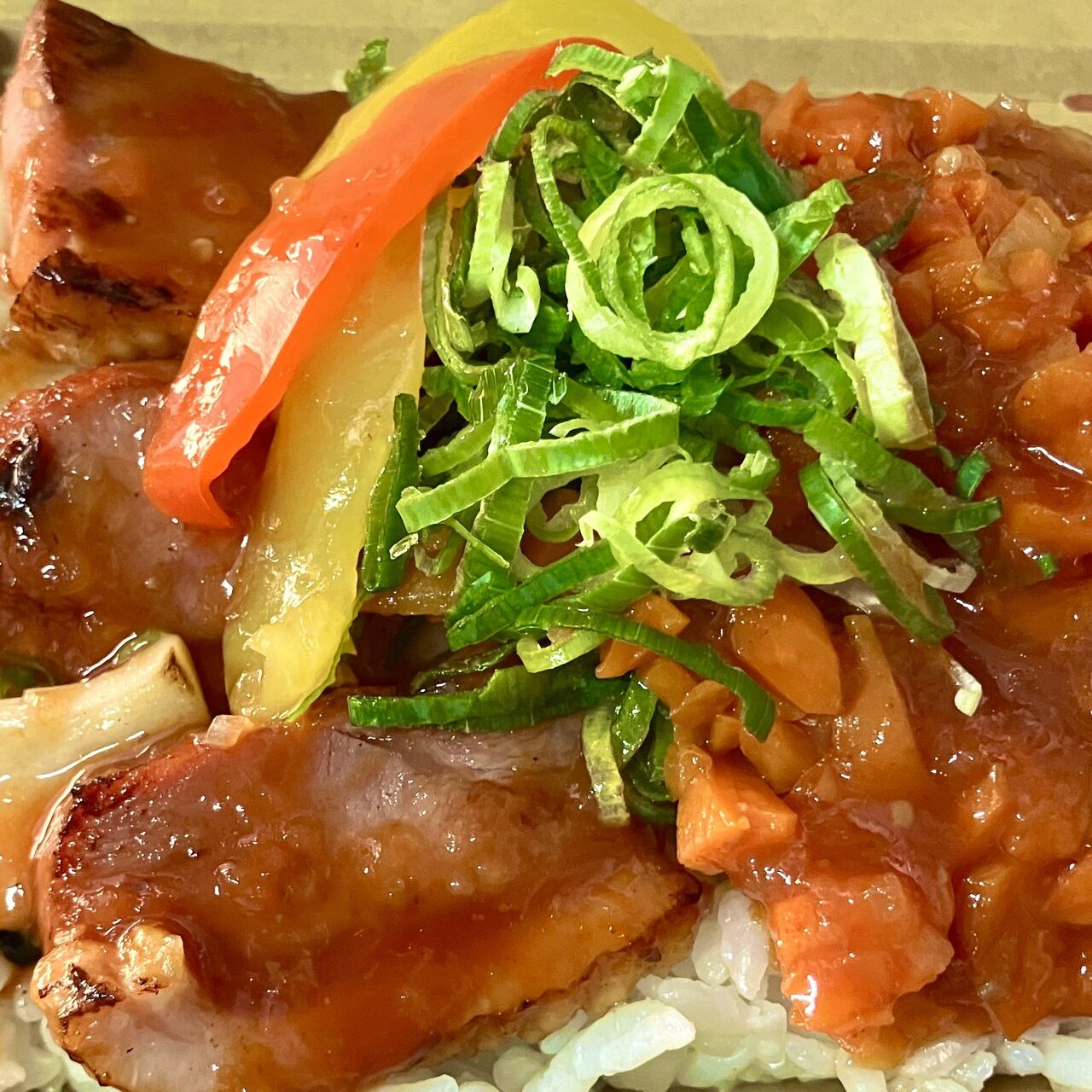 鴨ロースとえりんぎを一緒に和風味付けで焼きあげ、ご飯の上にのせて、ねぎと当店自慢のトマト玉ねぎソースをかけて、和風の味と絡みさらに旨みを引き出しています。