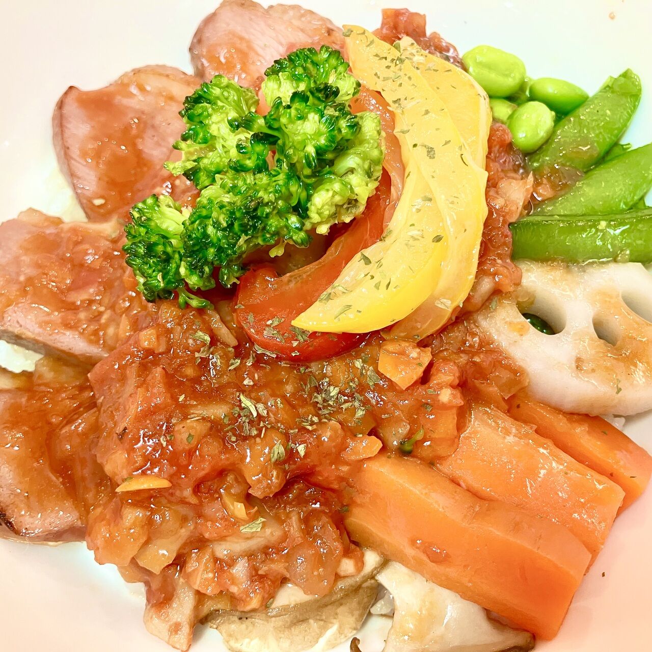 一日に必要な野菜の約半分が摂れる一品です。トマトベースにレモン風味のたっぶり野菜あんが、肉と野菜の旨さを引き立てます