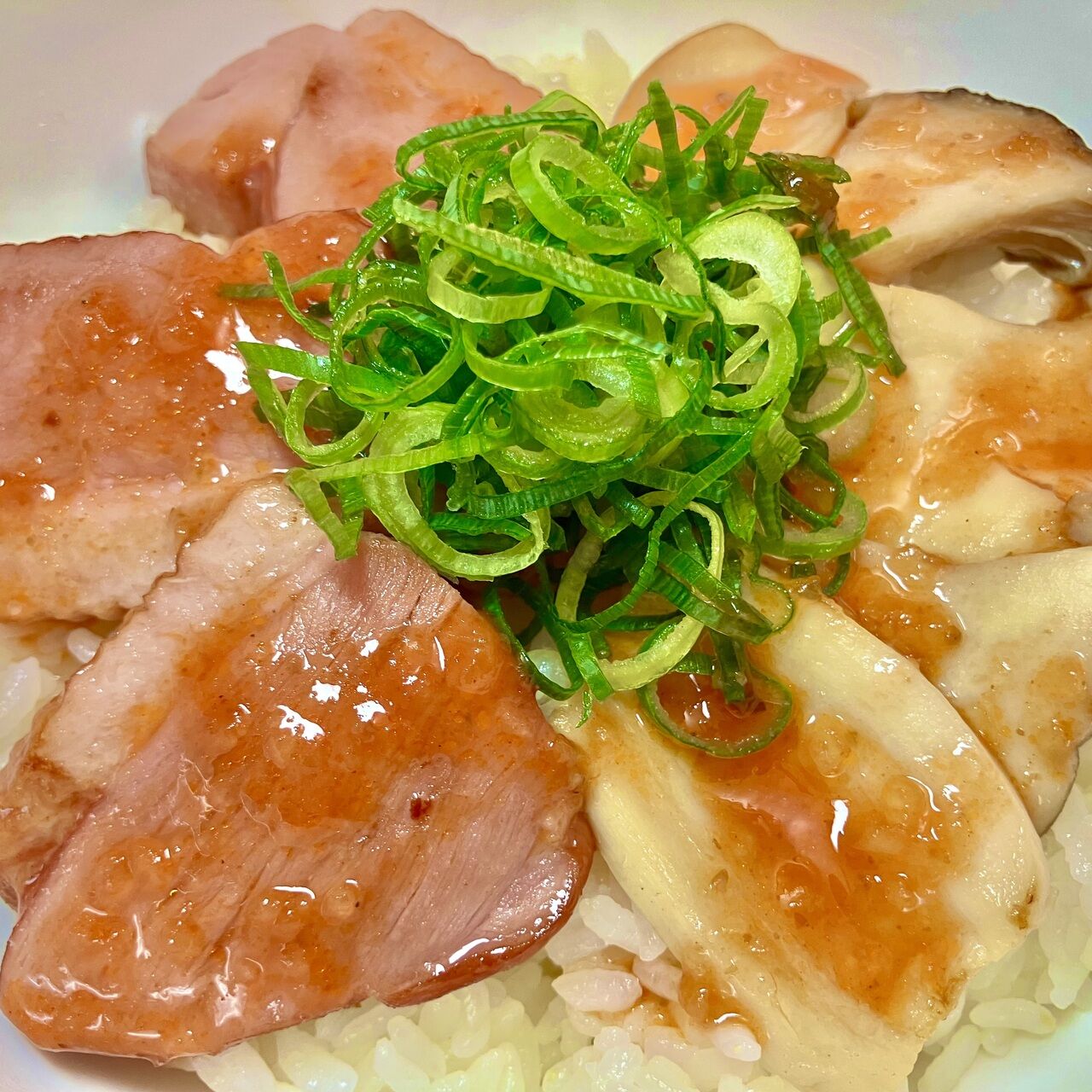 鴨ロースとえりんぎを一緒に和風味付けで焼きあげ、ご飯の上にのせて、ねぎと当店自慢のトマト玉ねぎソースをかけて、和風の味と絡みさらに旨みを引き出しています。