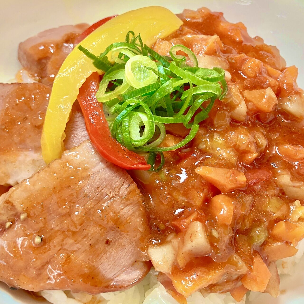 鴨ロース丼に、当店自慢の野菜の出し汁とたっぷりの野菜が入ったトマトベースのあんをかけ、彩りよく仕上がりました。酸味と旨みが効いて食欲をそそります。
