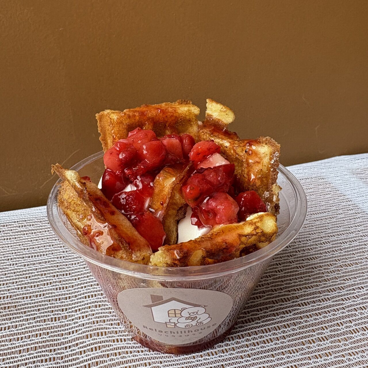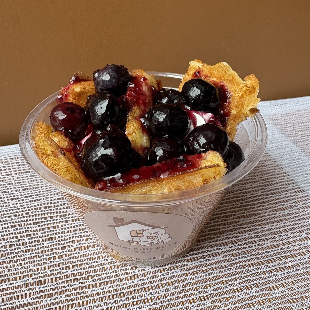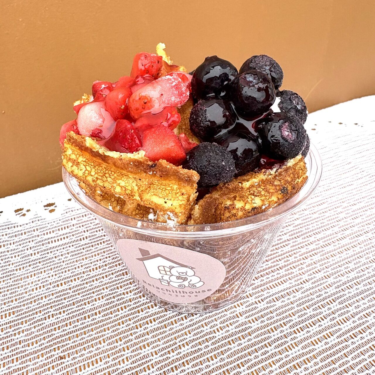 コロコロワッフルにストロベリー、ブルーベリー、ホイップ、ソースをトッピングした贅沢な一品です。