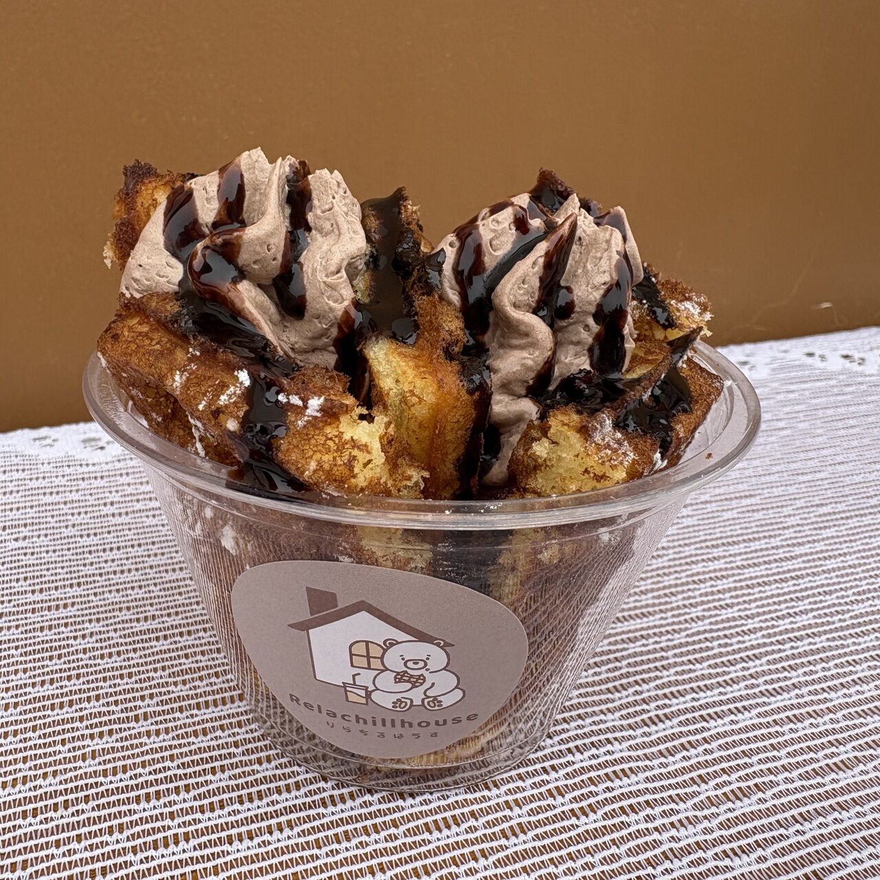 チョコソースとホイップをトッピングしたカップワッフルです。