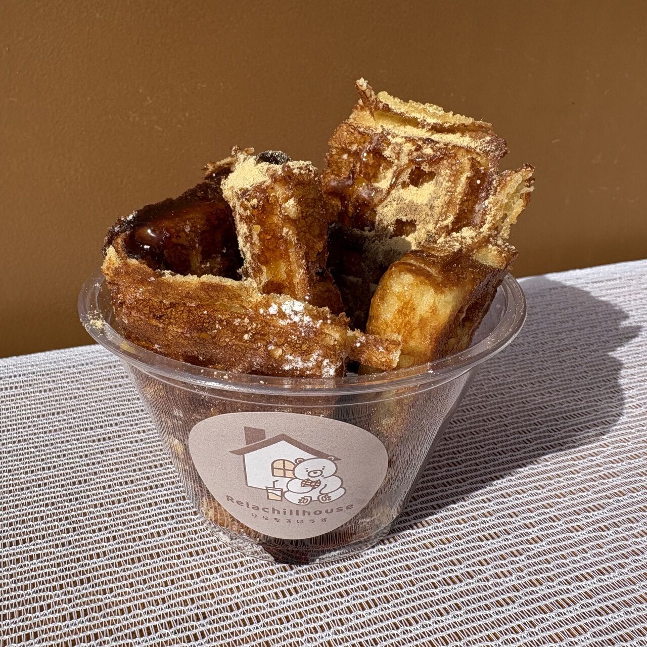 黒蜜ときなこをトッピングしたカップワッフルです。