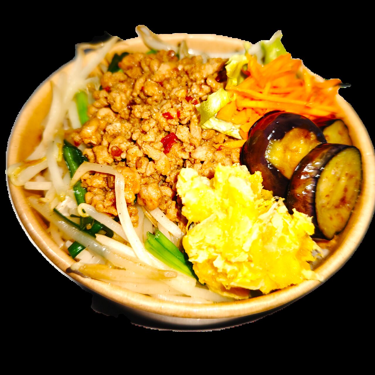 ニンニクの効いたピリ辛ひき肉・もやし・ニラの炒め物に鶏からと惣菜がのって、スタミナ&ボリューム満点のどんぶりです。
