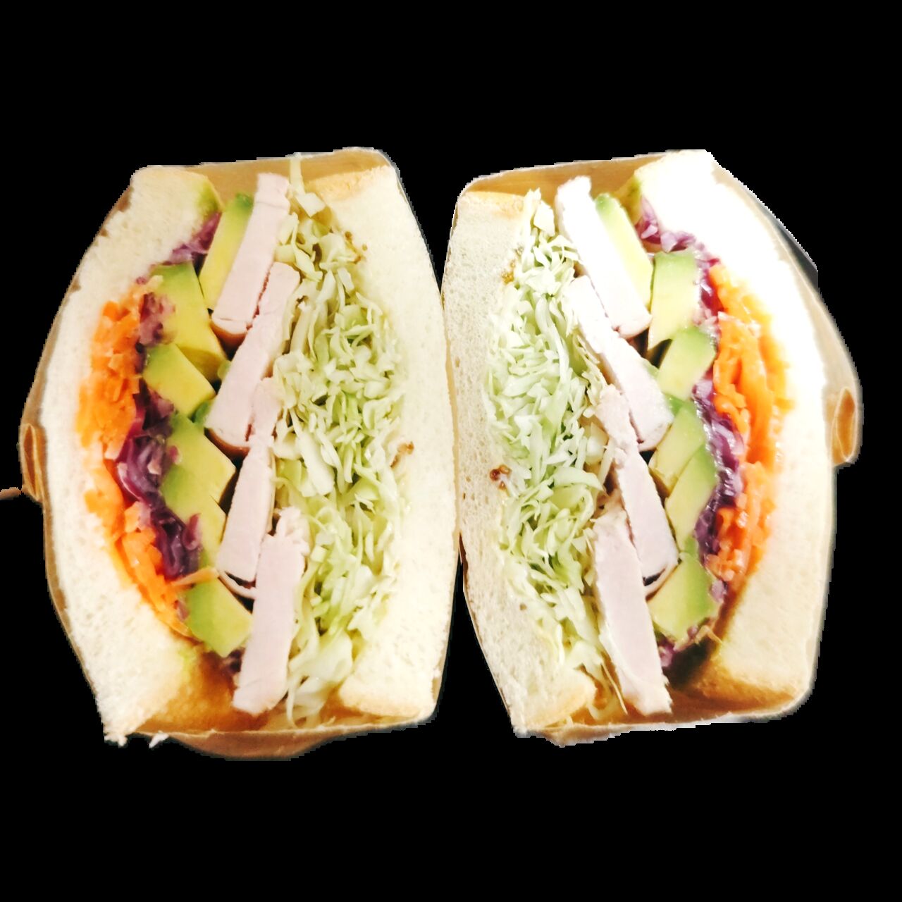 スモークチキンと3種の野菜、さらにアボカドを具材にしたサンドイッチ。健康志向のサンドイッチです。