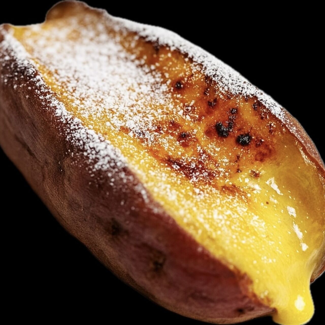 京都府産の紅はるかを使用。蜜たっぷりの焼き芋にカスタードクリームを挟み、ブリュレをしています。お芋とカスタードの甘さとブリュレのパリパリ食感をお楽しみください。